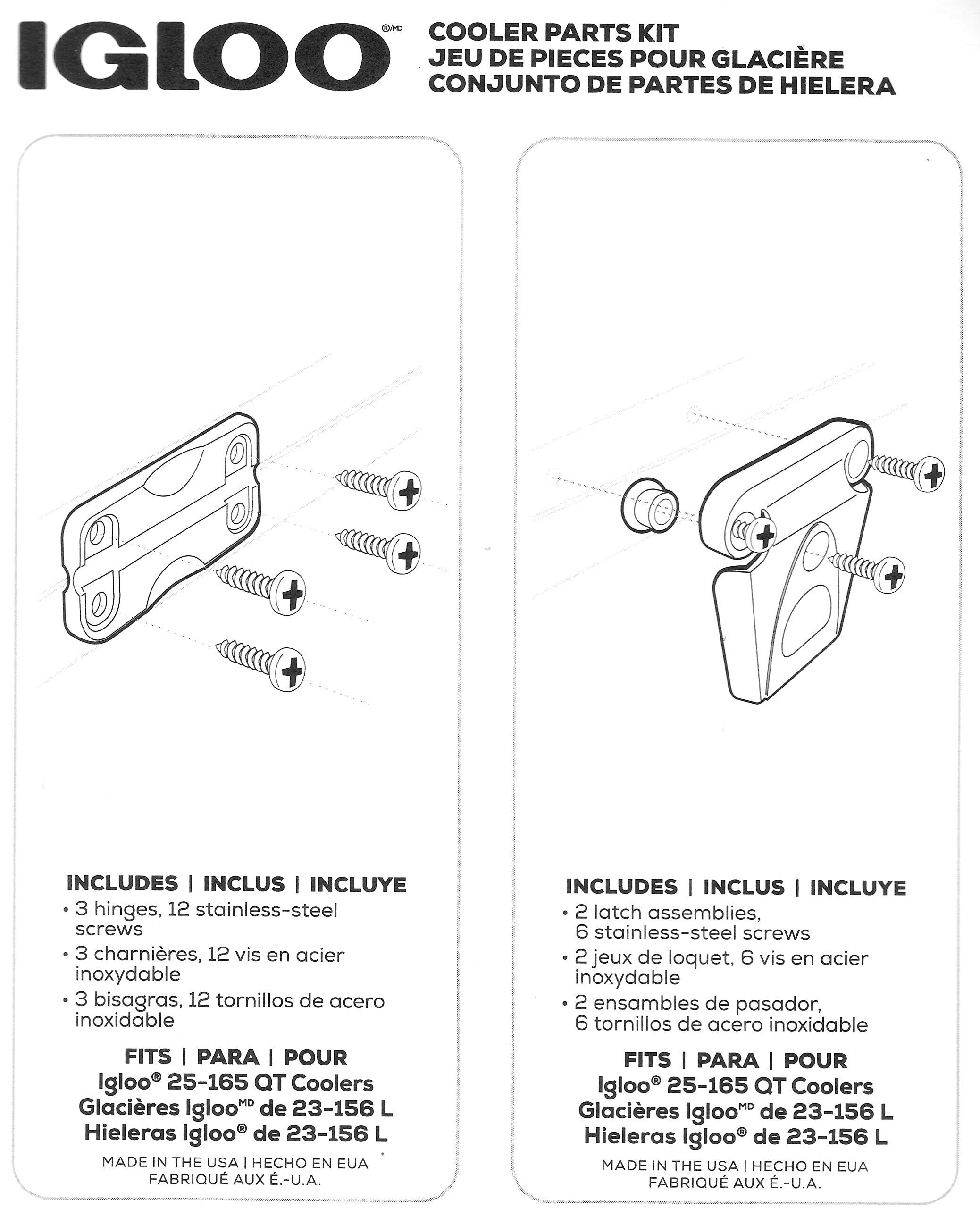 Igloo Cooler プラスチックパーツキット - 米国製 - ラッチ2個、ヒンジ3個、ラッチポスト&ネジ。