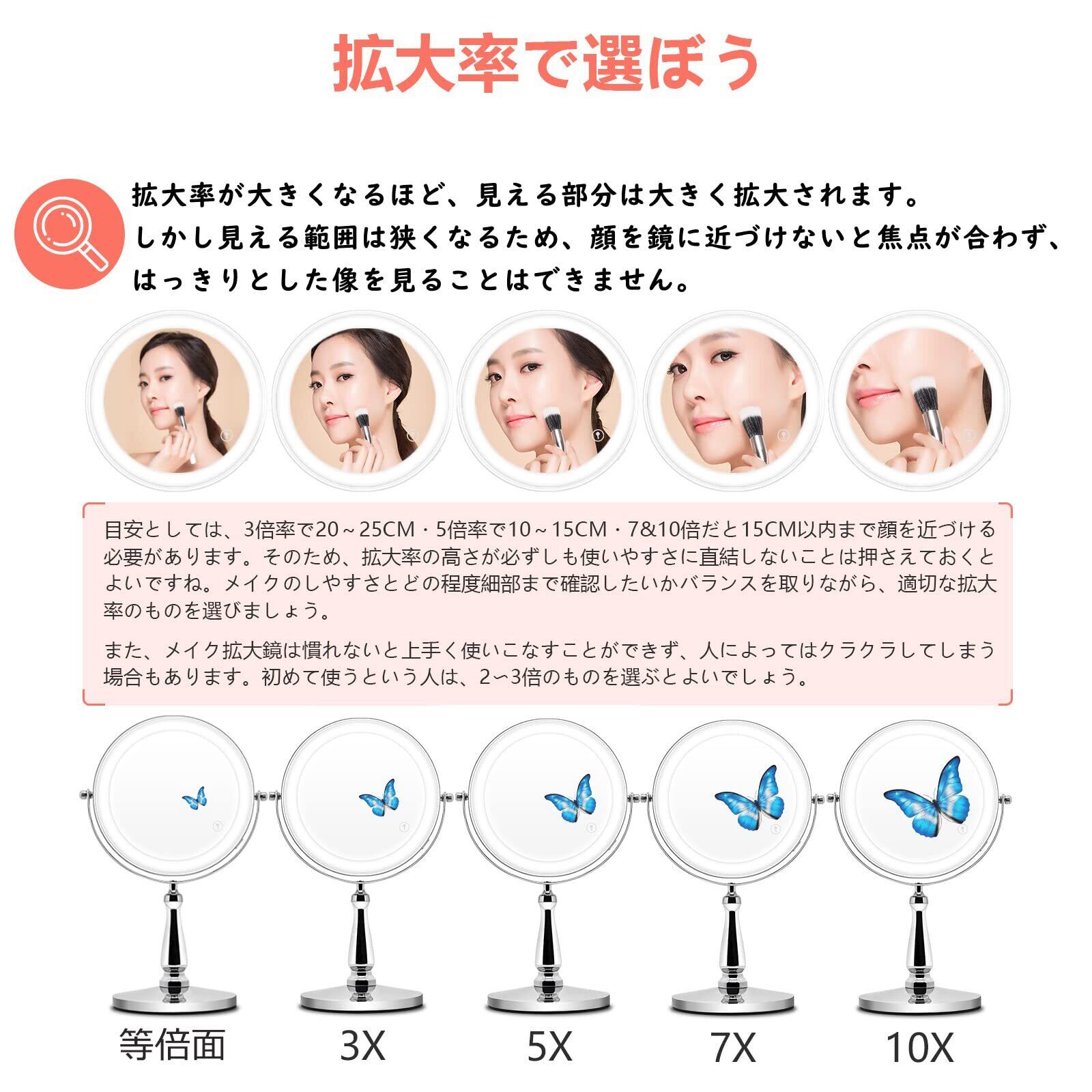 【日本語説明書付】:目安としては、3倍率で20~25cm・5倍率で10~15cm・7&10倍だと15cm以内まで顔を近づける必要があります。そのため、拡大率の高さが必ずしも使いやすさに直結しないことは押さえておくとよいですね。メイクのしやすさとどの程度細部まで確認したいかバランスを取りながら、適切な拡大率のものを選びましょう。また、メイク拡大鏡は慣れないと上手く使いこなすことができず、人によってはクラクラしてしまう場合もあります。初めて使うという人は、2〜3倍のものを選ぶとよいでしょう。