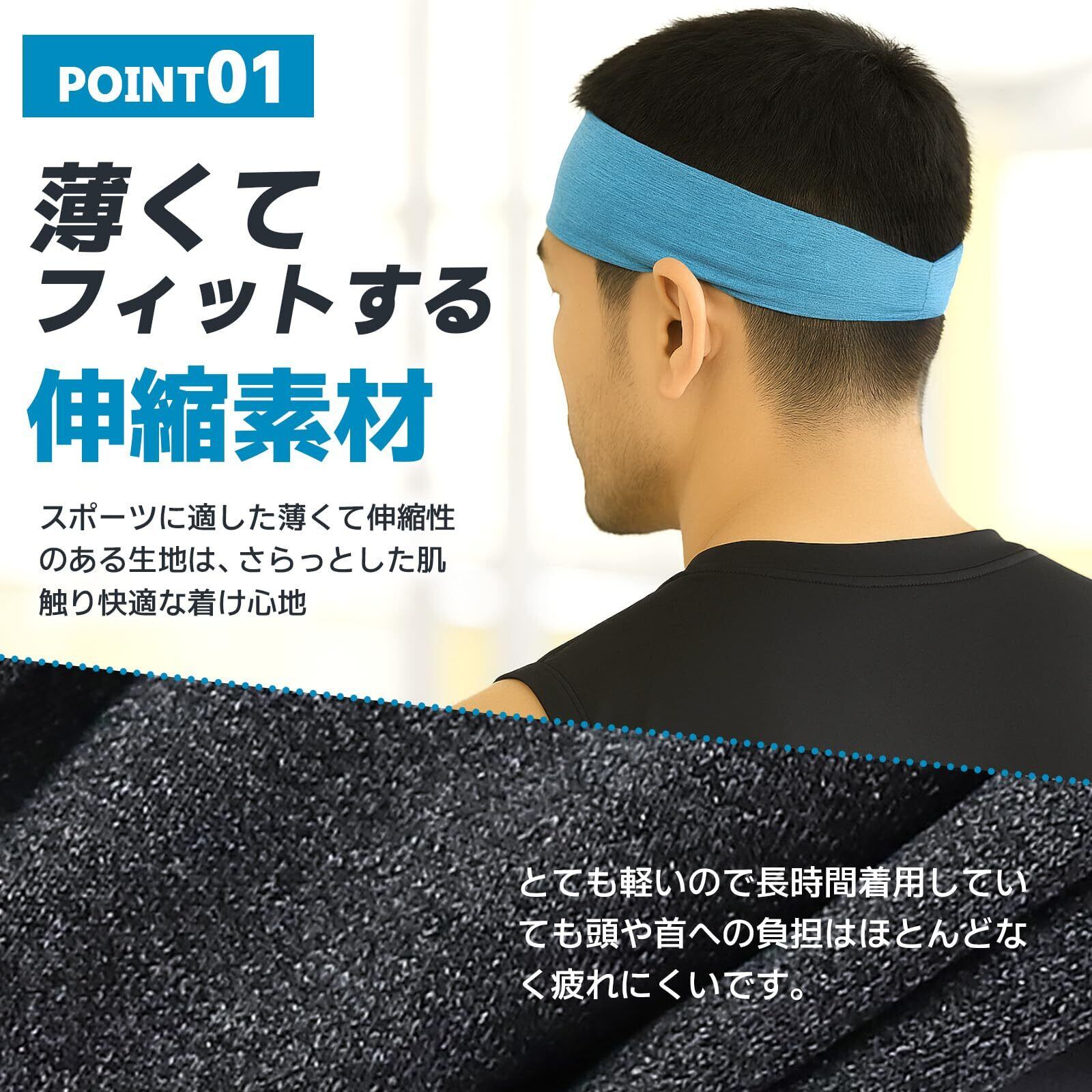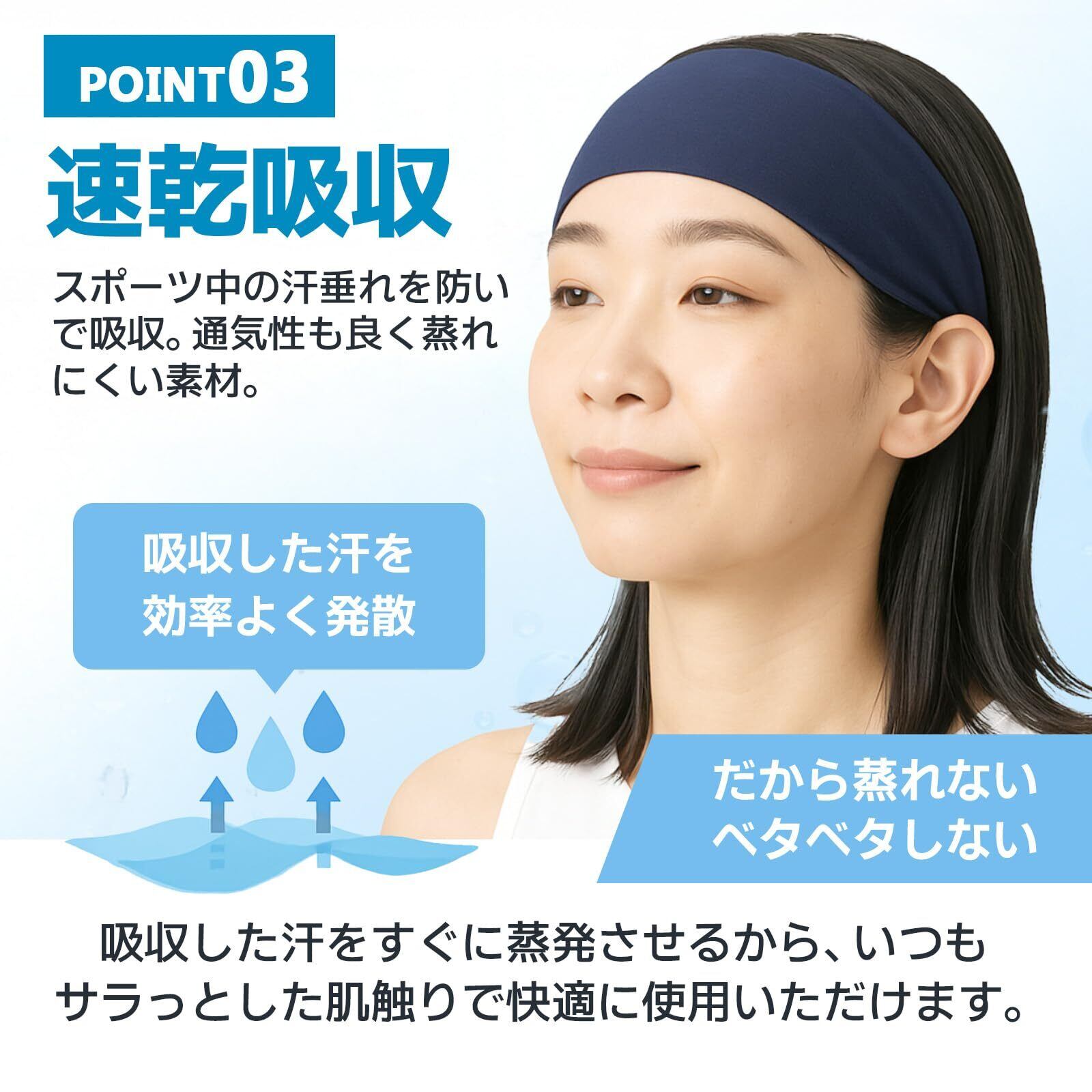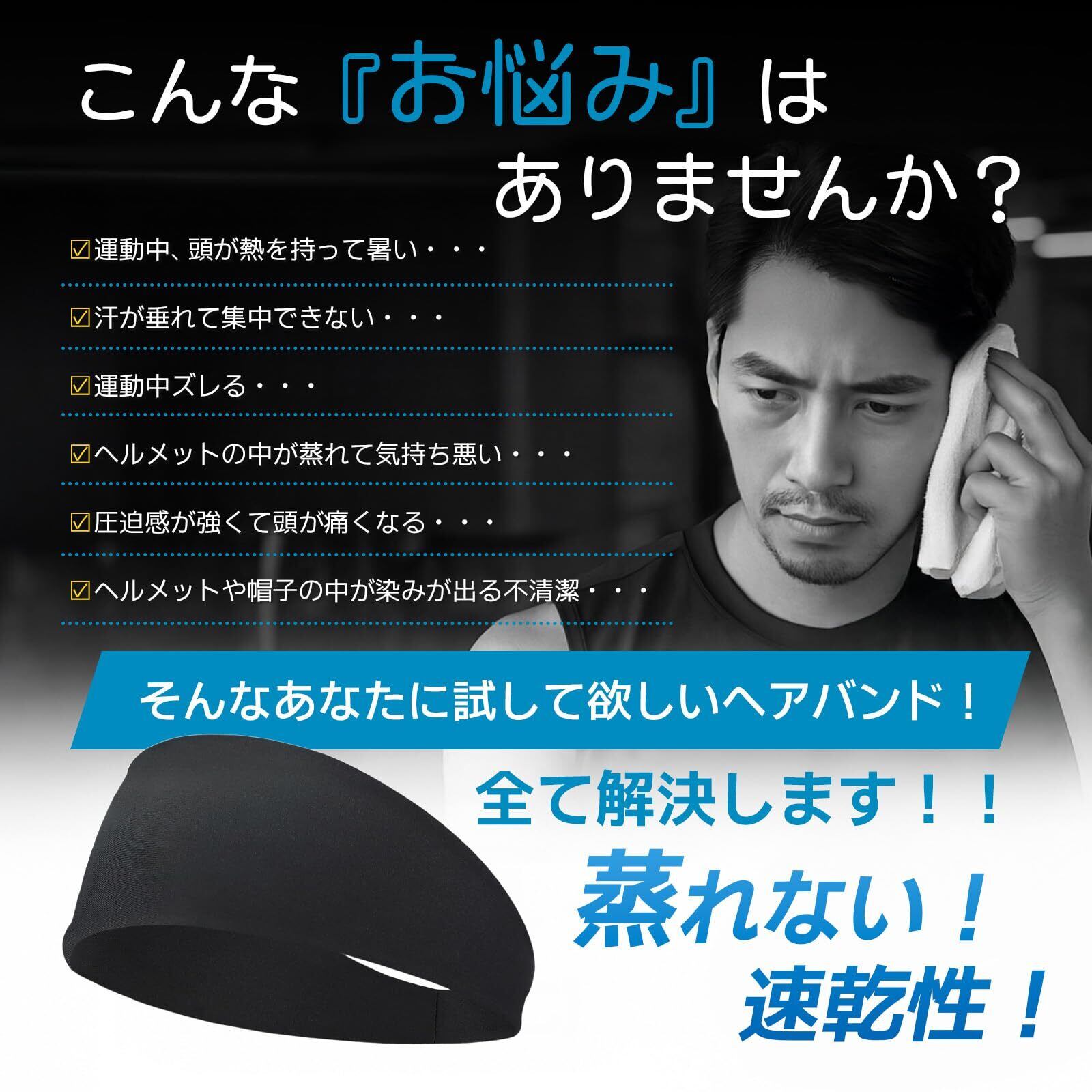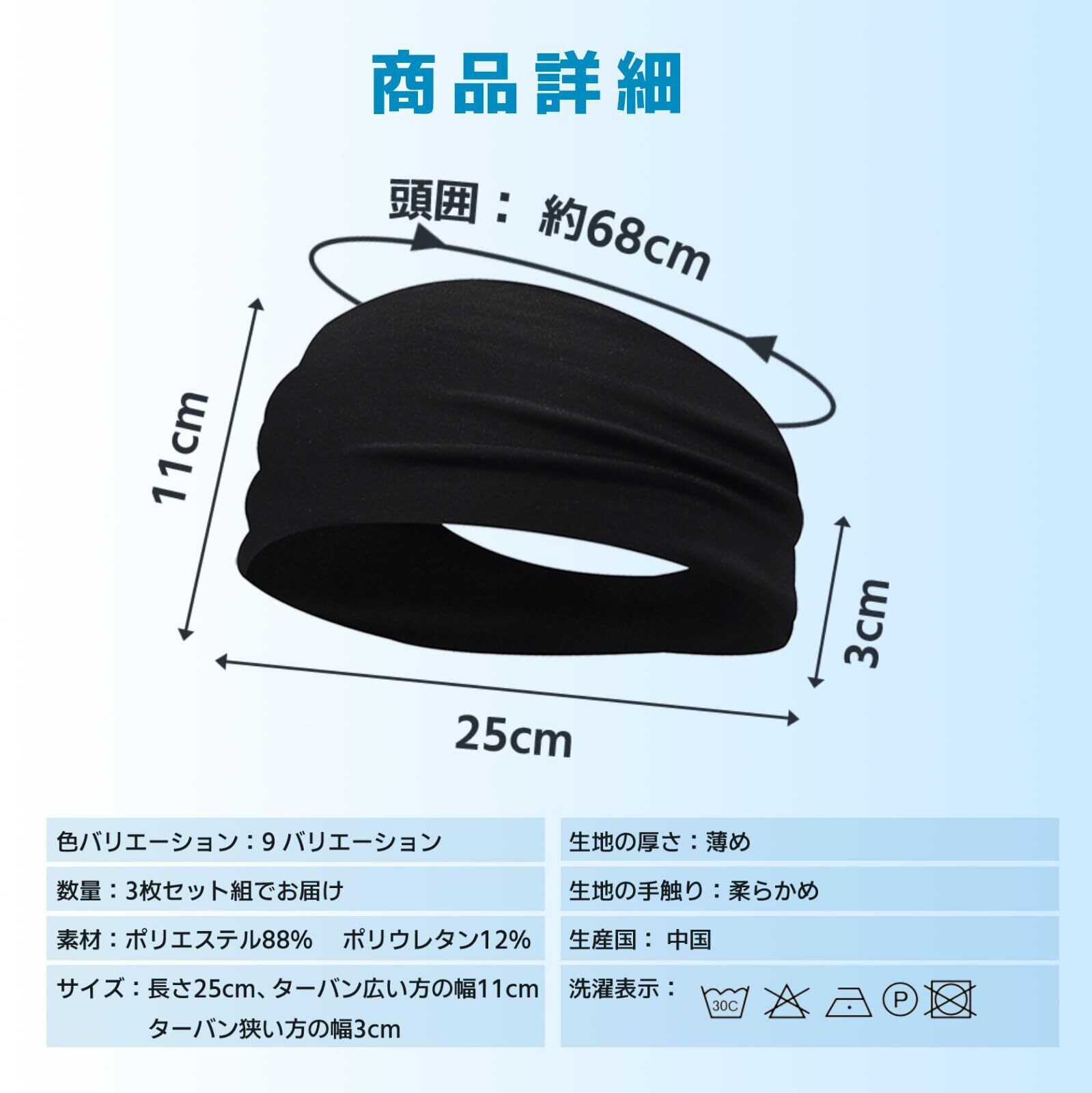 【ヘアバンド仕様】材質:ポリエステル 88% スパンデックス12% ターバン約25cm長、約11cm額幅 「額部分幅約11cm:後頭部分幅約3㎝」 額部分の面積が広く、吸水性が抜群なヘアバンド。