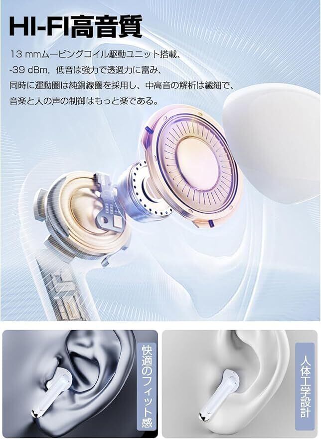 【高忠実な音質を復元・13mm大口径ドライバー・ENC通話ノイズキャンセリング】 イヤホンは低音が豊かで、高音がはっきりしていて、音質がバランスがとれていて、原音を復元し、音楽の細部をリアルに復元することができ、さまざまな楽器の音、方位、リズムを聞くことができます。音楽の現場にいるように見えます。ワイヤレスイヤホンに13mmの大口径ドライバーを搭載し、音の粒立ちが良く、歯切れのいい音楽が再生されます。迫力ある低音から自然な中音、伸びやかな高音まで幅広く楽しめ、きれいな立体的な音を与え、音楽による没入感を楽しむことができます。イヤホンは高性能マイクとENC/CVC8.0 通話 ノイズキャンセリング技術により、周囲の環境騒音を識別して感じ、最高騒音低減深さは-39 dBに達し、通話中に相手に自分の声をはっきり伝えることができる。通話、オンライン授業、会議など会話に最適!効率的に会話を進められます。