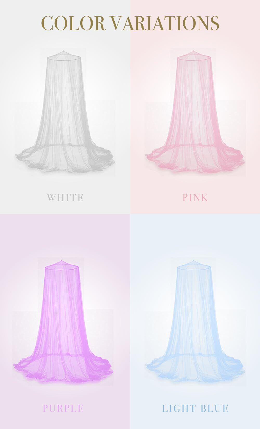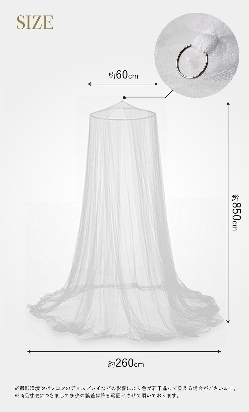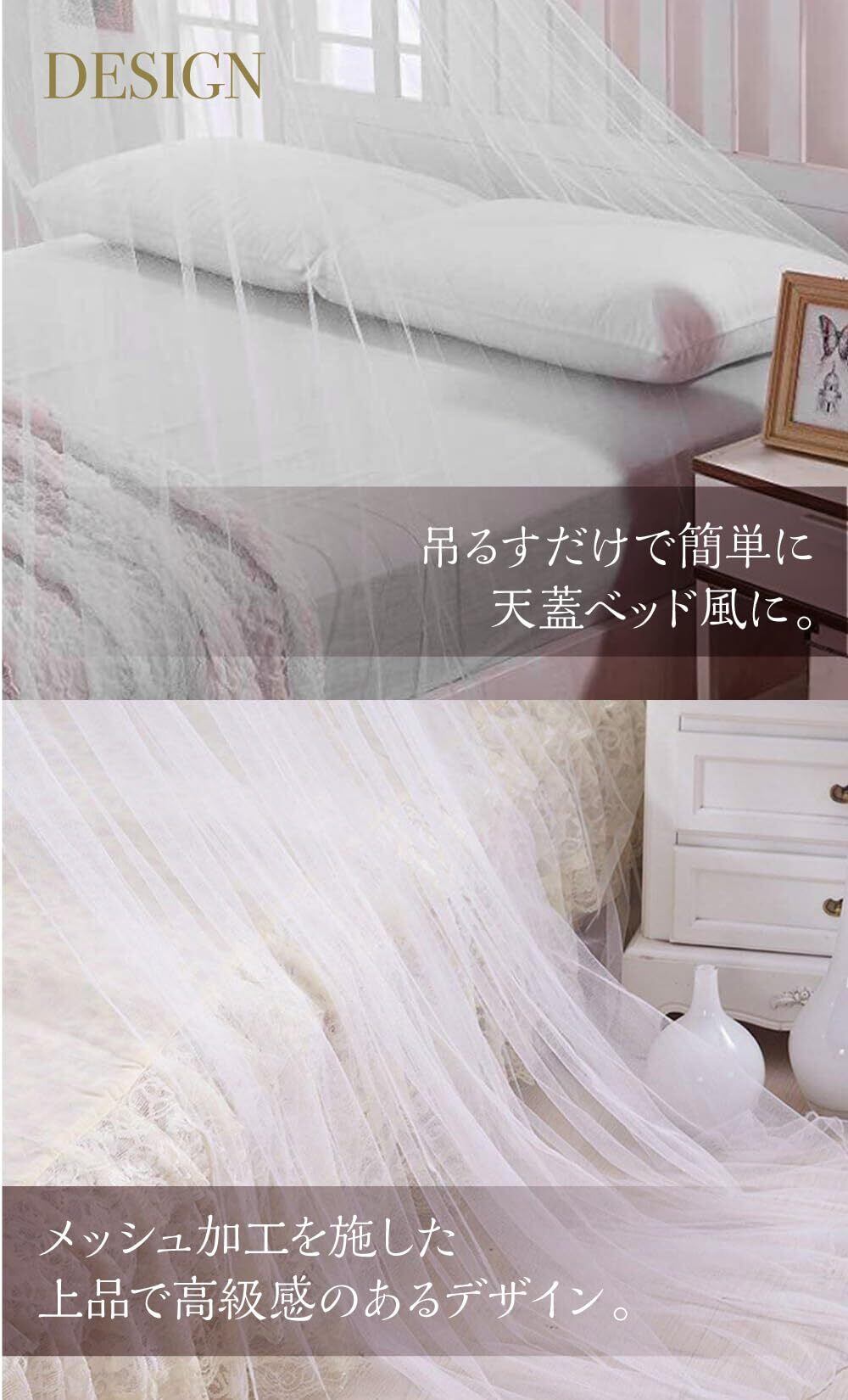 【お姫様気分を楽しめる天蓋カーテン】憧れのお姫様気分を体験できる吊り下げ式の蚊帳です。天井から簡単に吊るすだけで、お部屋がたちまちロマンチックな空間に変わります。ソフトなメッシュ生地がインテリアに優雅さを加え、毎晩の就寝を特別な時間に変えてくれます。
