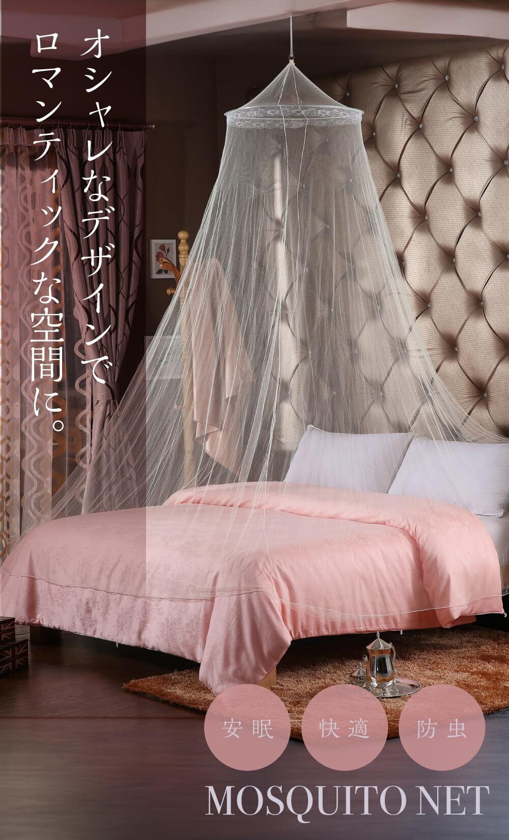 円柱形のデザインがどんなインテリアにもマッチし、お部屋にロマンスと洗練された雰囲気をもたらし、大人も子供も美しい蚊帳の下で快適に過ごせます。