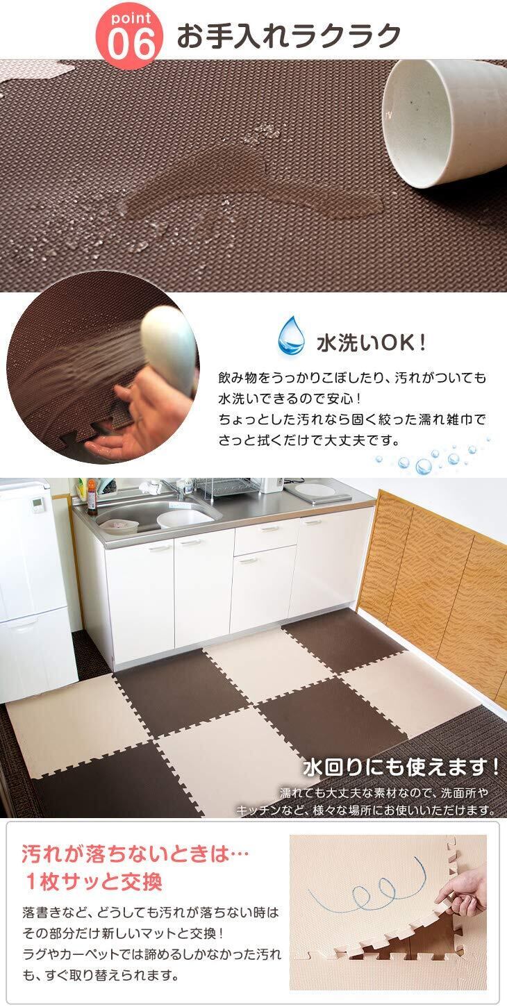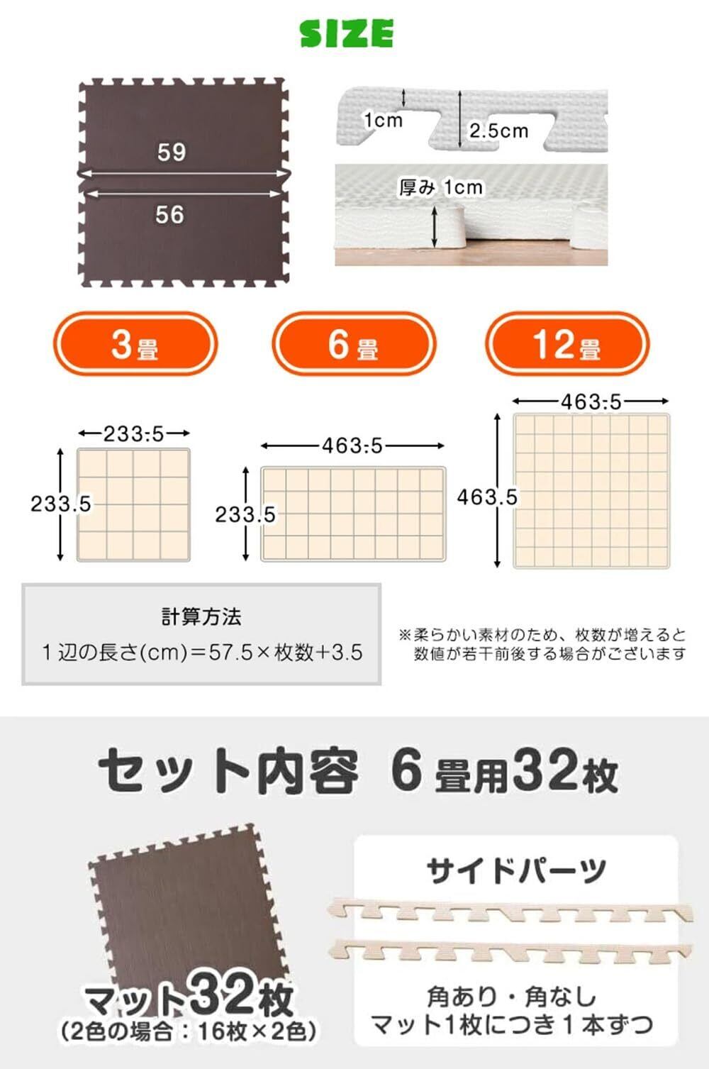 "・表面の凹凸の深さに若干の個体差がある場合がございます。 ・ロットによって色味が異なる場合がございます。 ・床暖房の種類等によって、商品に多少の反りが生じる場合がございます。 ・PE素材の特性上、使用するうちに負荷がかかる部分に多少のへたりが生じます。 そのため、既に使用しているマットに新しいマットを繋げて使用する際、上手く繋がらない場合もございますので、予めご了承ください。 2019年1月10日に素材をEVAからPEに変更しました ※床材(塩化ビニル・フローリング等)によって、色移りや変色が起こる場合がございます。床とマットの間に敷物や防護シートを敷いていただくことを推奨しております。"