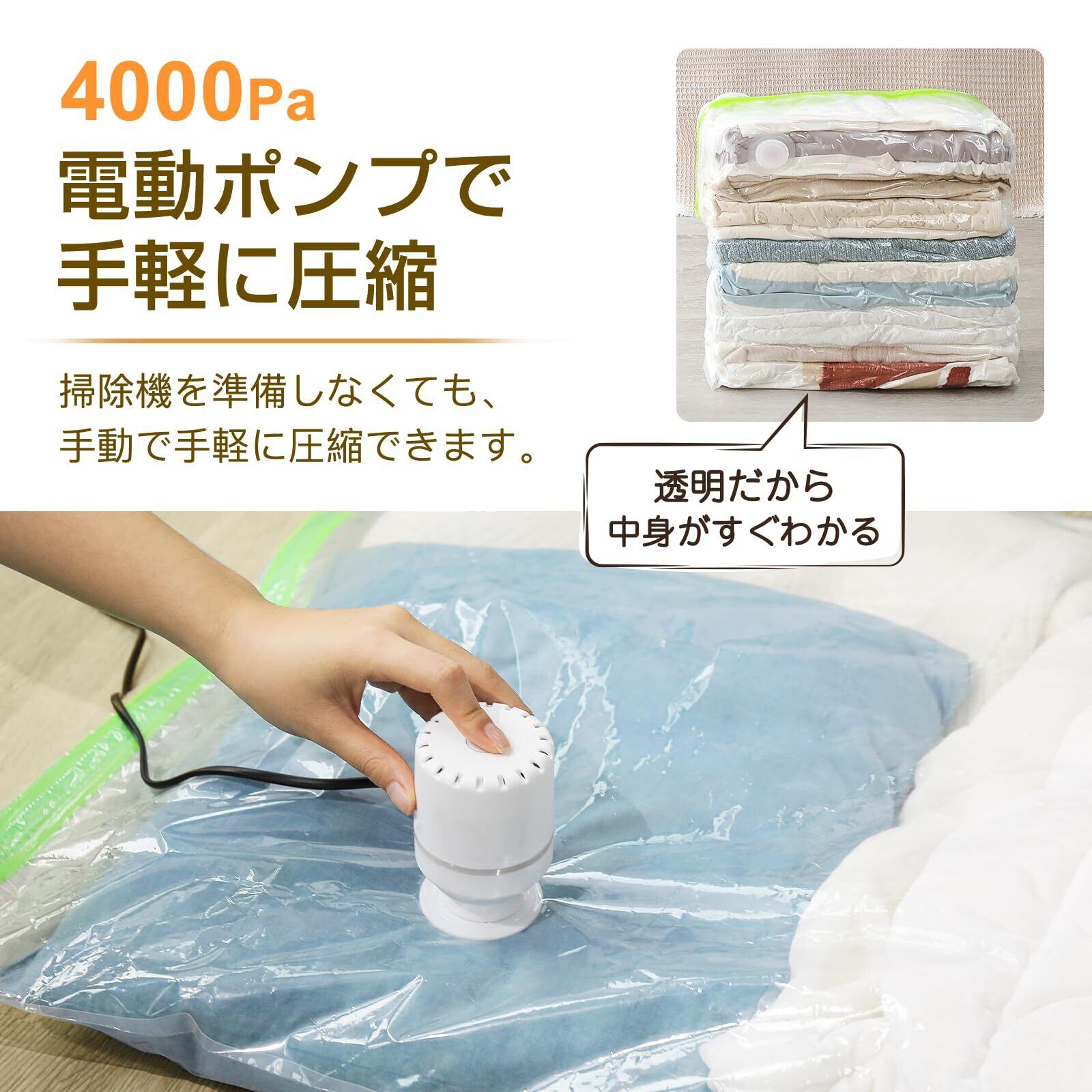 【電動ポンプ付き、使いやすい】衣類や布団などを入れて、付属するスライダーでチャックを完全に閉めて、電動ポンプを用いてあっしゅく袋を効率よく圧縮収納できます。また手動吸引ポンプも付属、手動吸引ポンプを合わせ、最後まで圧縮力をアップ!ボリュームたっぷりのパックで布団から薄手の衣類まで多用途な圧縮袋としてお使いいただけます。