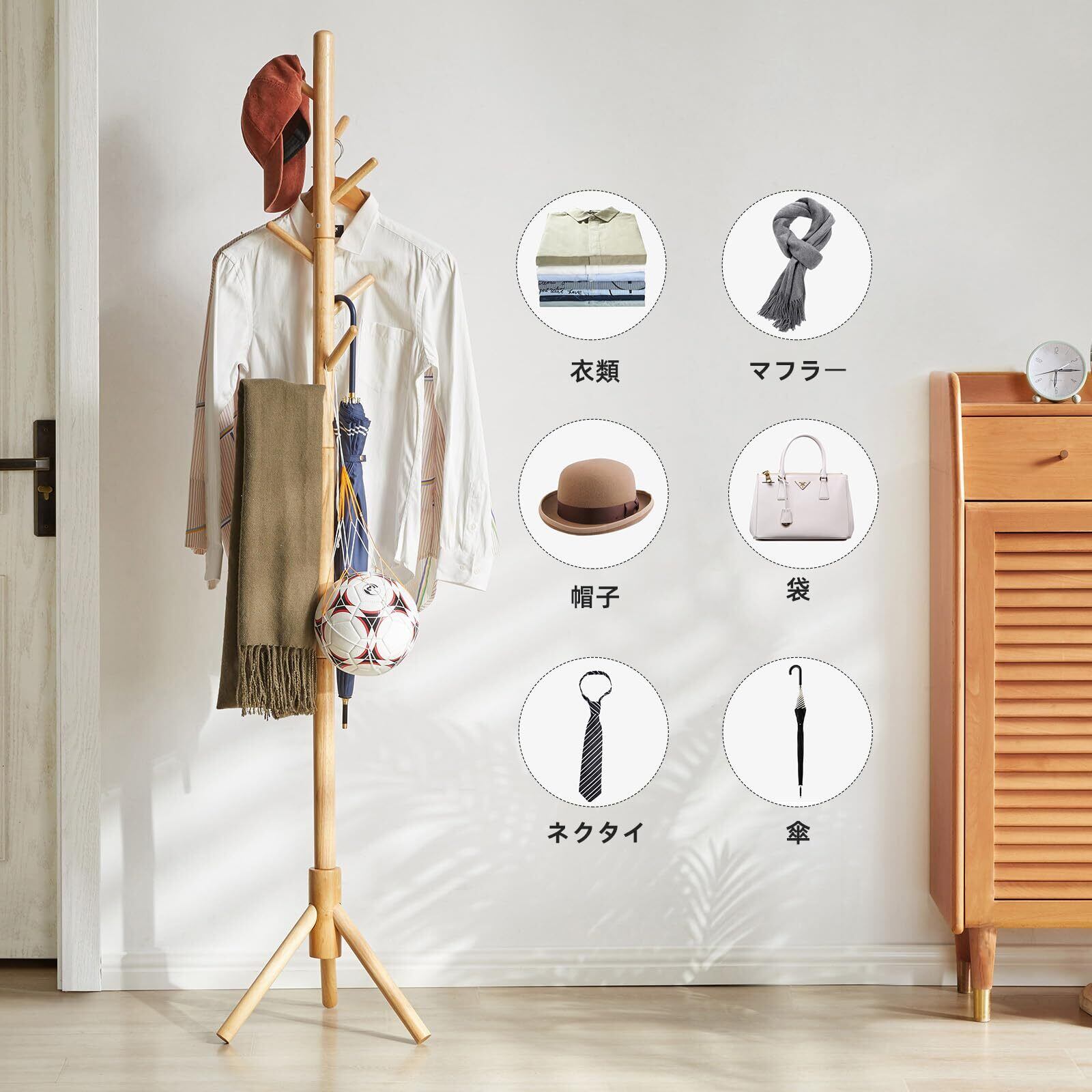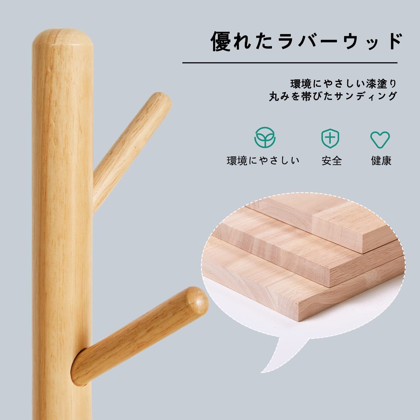 安定感のあるポールハンガー: このポールハンガーは、堅牢な木材を使用し、三角ベースです。各フックに3kgの荷重を支えることができ、最大合計15kgの荷重を受けることができます
