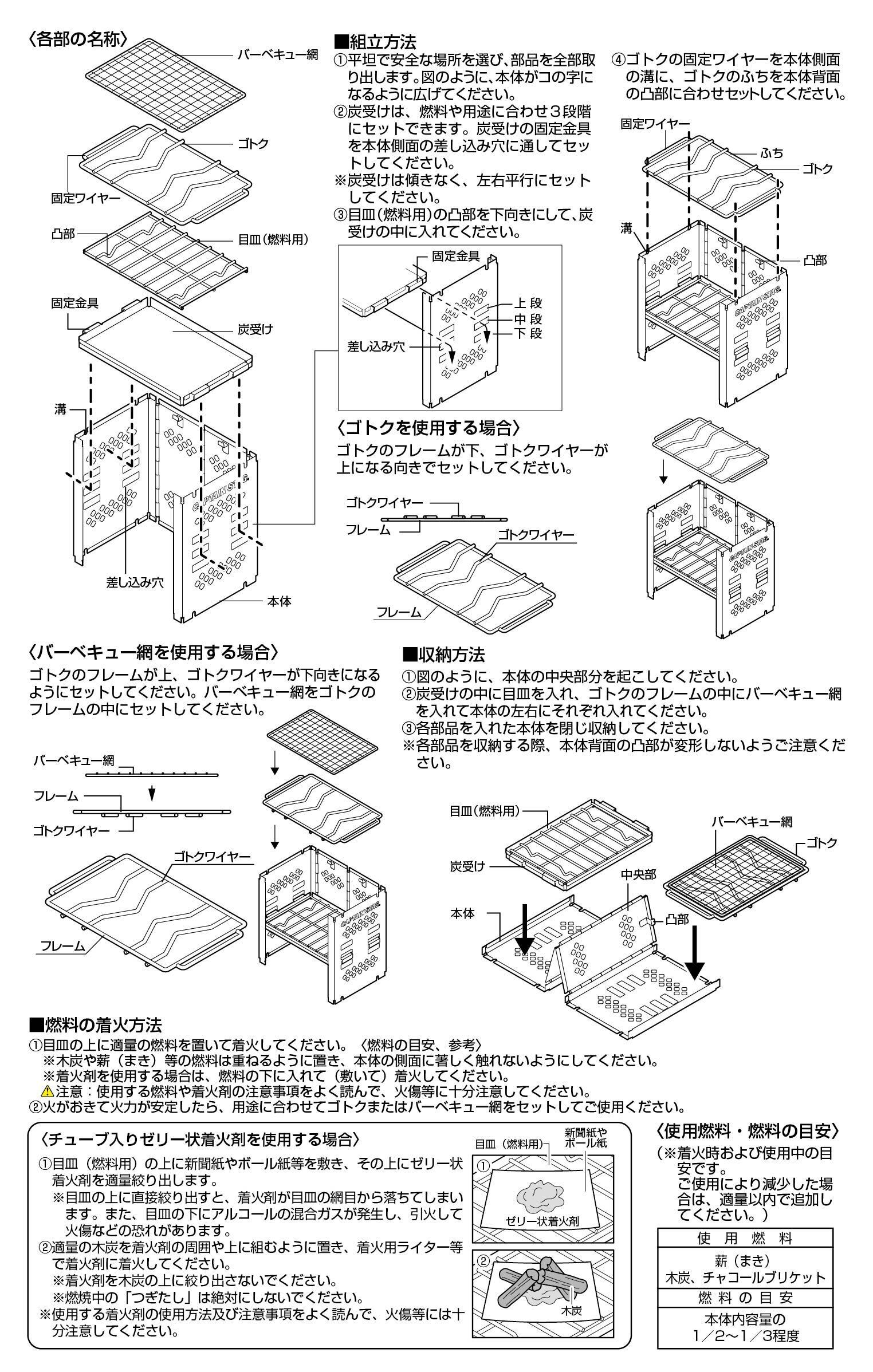 材質:本体・炭受け=ステンレス鋼、ゴトク・アミ・目皿=鉄(クロムめっき)、収納バッグ=ポリエステル