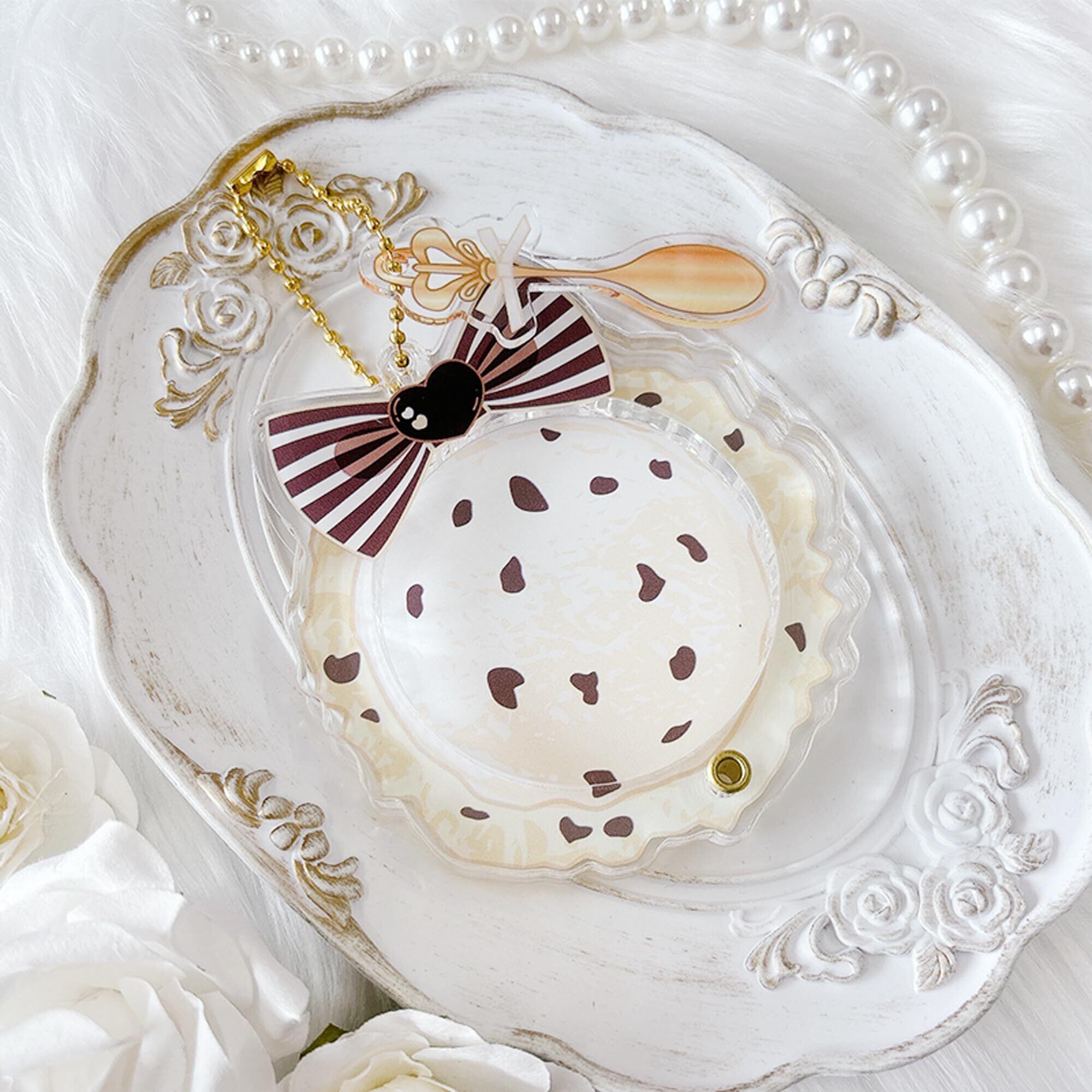 オリジナルアイスクリーム型の缶バッジ用アクリルフレーム、取り外し可能なスプーンのアクリルチャームが付いております。