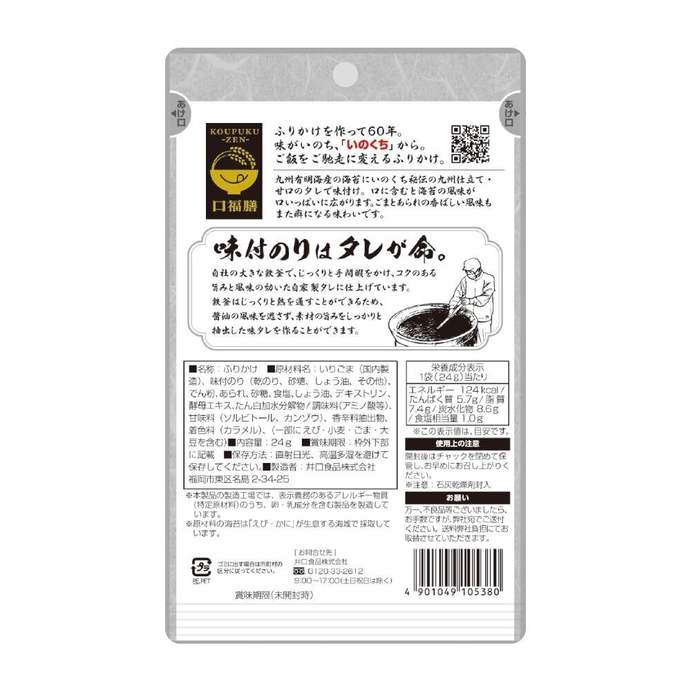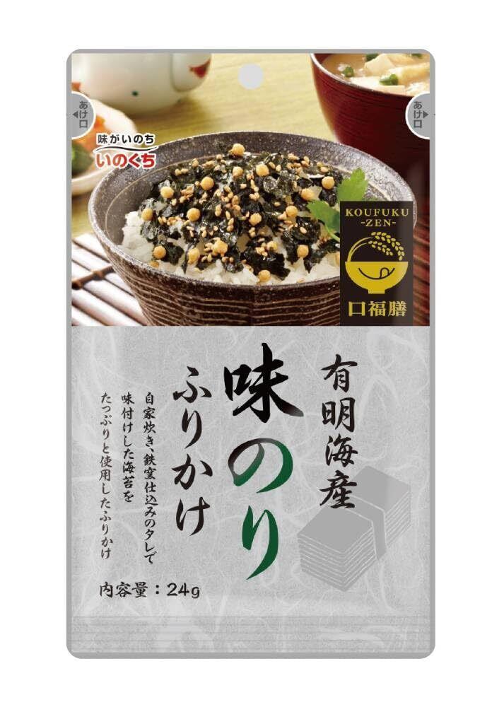 ふりかけを作って60年。味がいのち、「いのくち」から。ご飯をご馳走に変えるふりかけ。有明産の味付海苔をふんだんに使用した海苔ふりかけです。 海苔は「いのくち」秘伝の九州仕立て・甘口のタレで味つけ。口に含むと海苔の風味が口いっぱいに広がります。ごまとあられの香ばしい風味もまた癖になる味わいです。