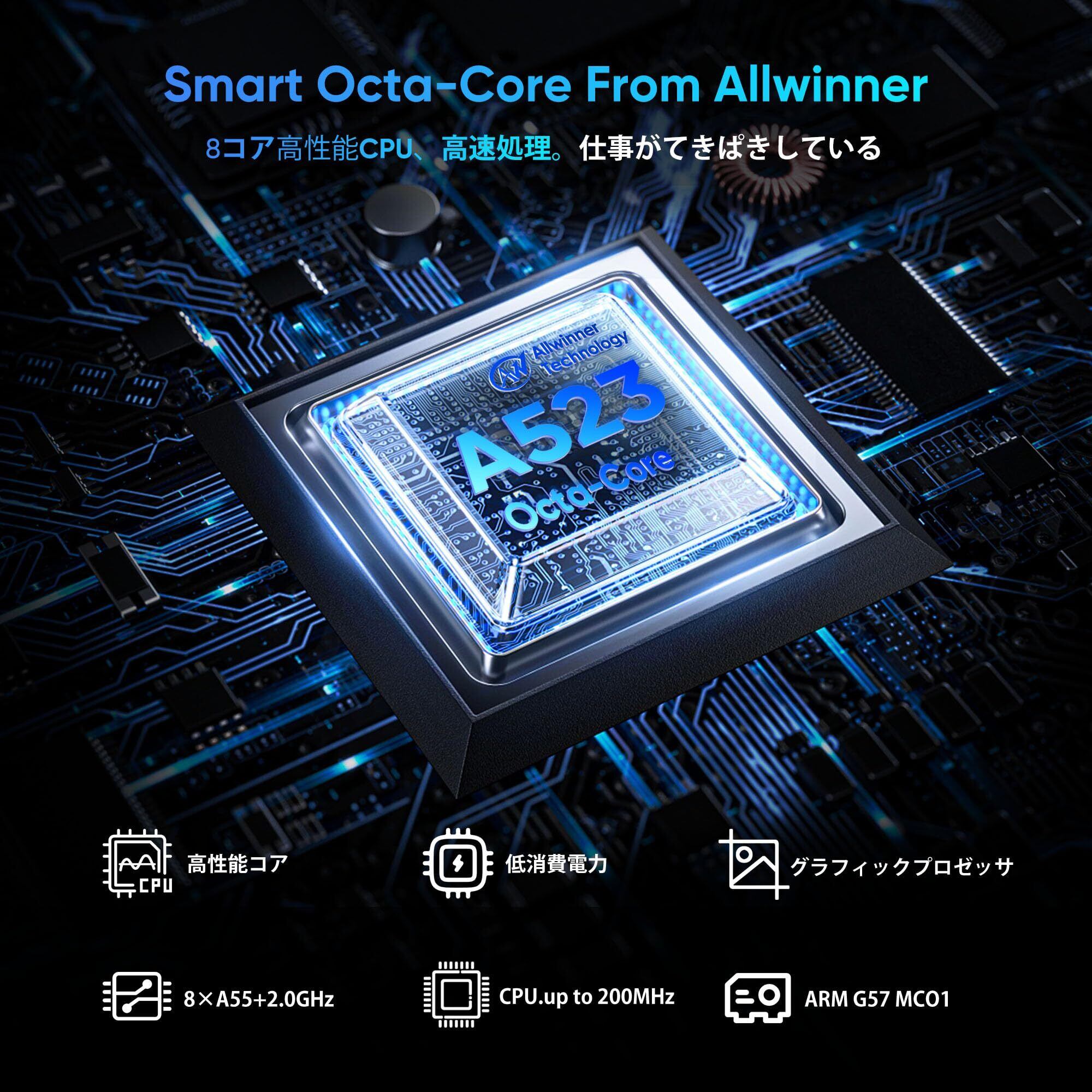 【8コア+2.0Ghz CPU+12GB+64GB+1TB拡張】このAndroid 14 タブレットNPad MiniはAllwinner A523プロセッサは、オクタコアA55アーキテクチャの設計を採用し、2.0GHz のメイン周波数を使用、クアッドコア製品の性能に比べて倍増されている。A55アーキテクチャのAI性能はA53と比較して6倍以上向上。低消費電力で高速な計算速度を実現します、よりスムーズなタブレット使用体験を提供します。AnTuTu のスコアは 315234 ポイントに達します。12GB RAM(4GBのRAMに加え8GBの拡張メモリー)、アプリケーションを素早く起動し、マルチタスクのウィンドウを非常にスムーズに処理することができます。外部ストレージカード(FAT32形式、別売り)を挿入することで最大1TBまでストレージ容量を拡張することも可能です。内部ストレージは64GB搭載しており、多くのファイル、アプリ、写真、ビデオなどを保存することができます。