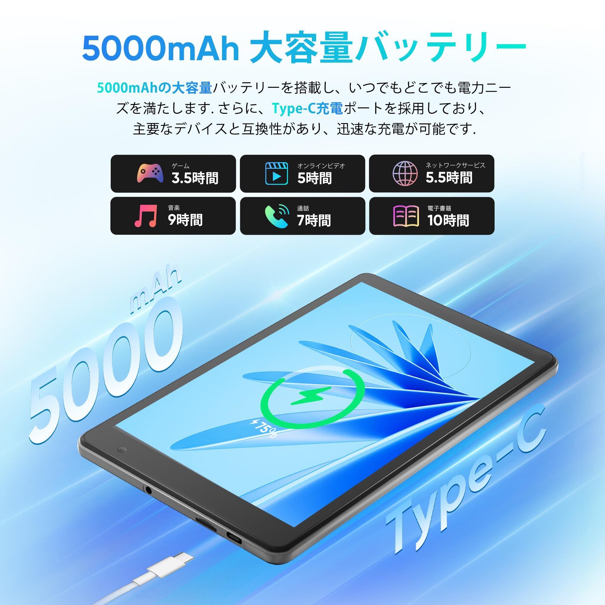 【2.4G/5G Wifi 6 +Bluetooth5.0+5000mAh+5MP+5MPカメラ】2.4G/5GデュアルバンドWi-Fi6とBluetooth 5.0、高い伝送効率、安定した接続。USB Type-C +独立した3.5mmのヘッドフォンジャックを備え、充電しても音楽聞いても互いに邪魔しません、様々なニーズに対応できます。5000mAh バッテリーを搭載し、AIインテリジェント電源管理により、待機時間は最大10時間、オンラインビデオ再生は6時間。Android 14タブレットにはHDカメラが搭載されており、5MPフロントカメラと5MPリアカメラが含まれており、いつでも人生の貴重な瞬間を捉え、自撮りやビデオ通話でより鮮明な画像を提供できます。