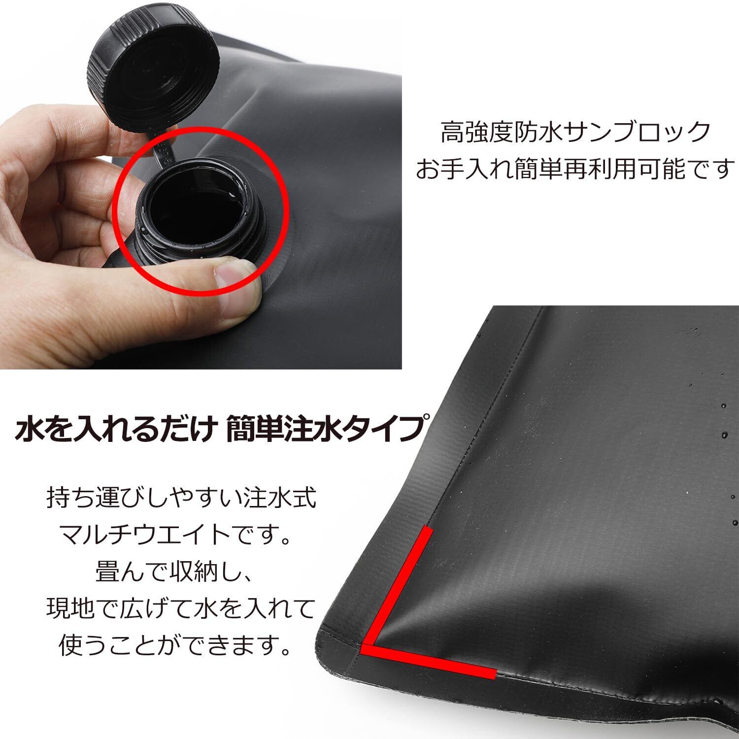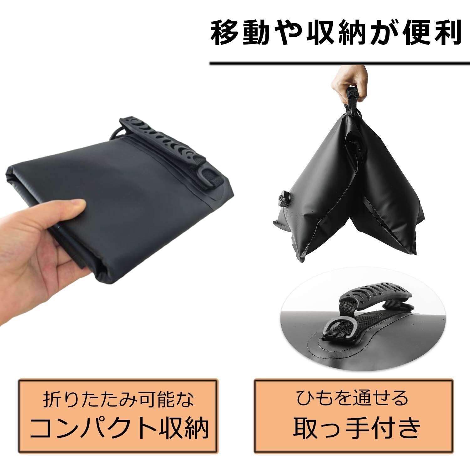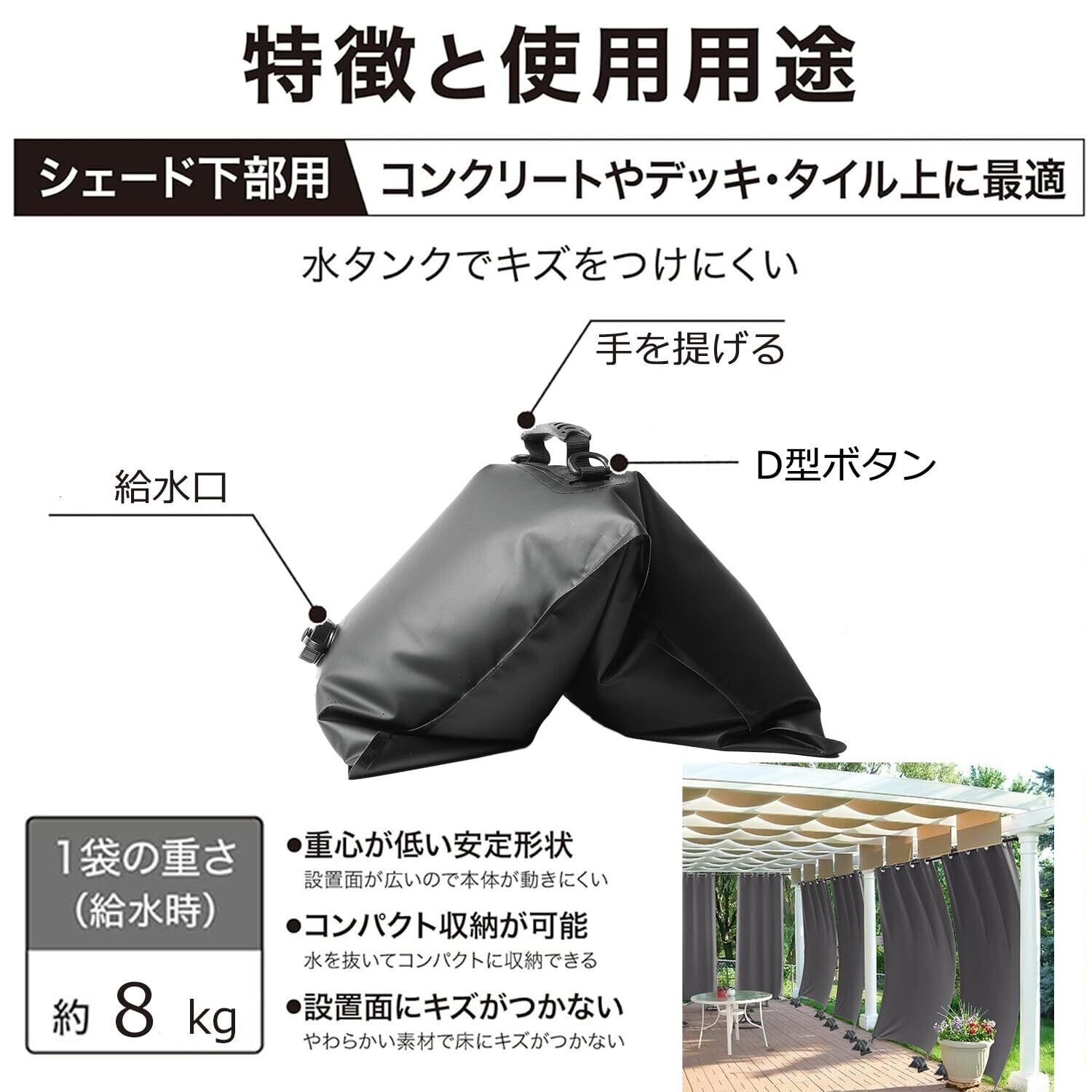 カラー:ブラック、給水時の重さ:約8kg(1個あたり)、4個組。高強度防水、サンブロック、お手入れ簡単、再利用可能です。