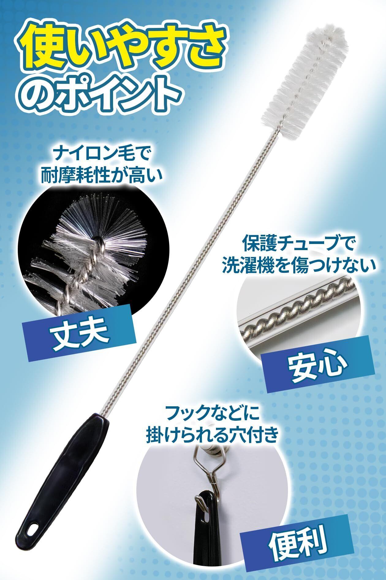 【使いやすさにこだわりました】ブラシヘッドは耐摩耗性が高いナイロン毛を使用。本体部分は洗濯機を傷つけないようチューブで保護しています。