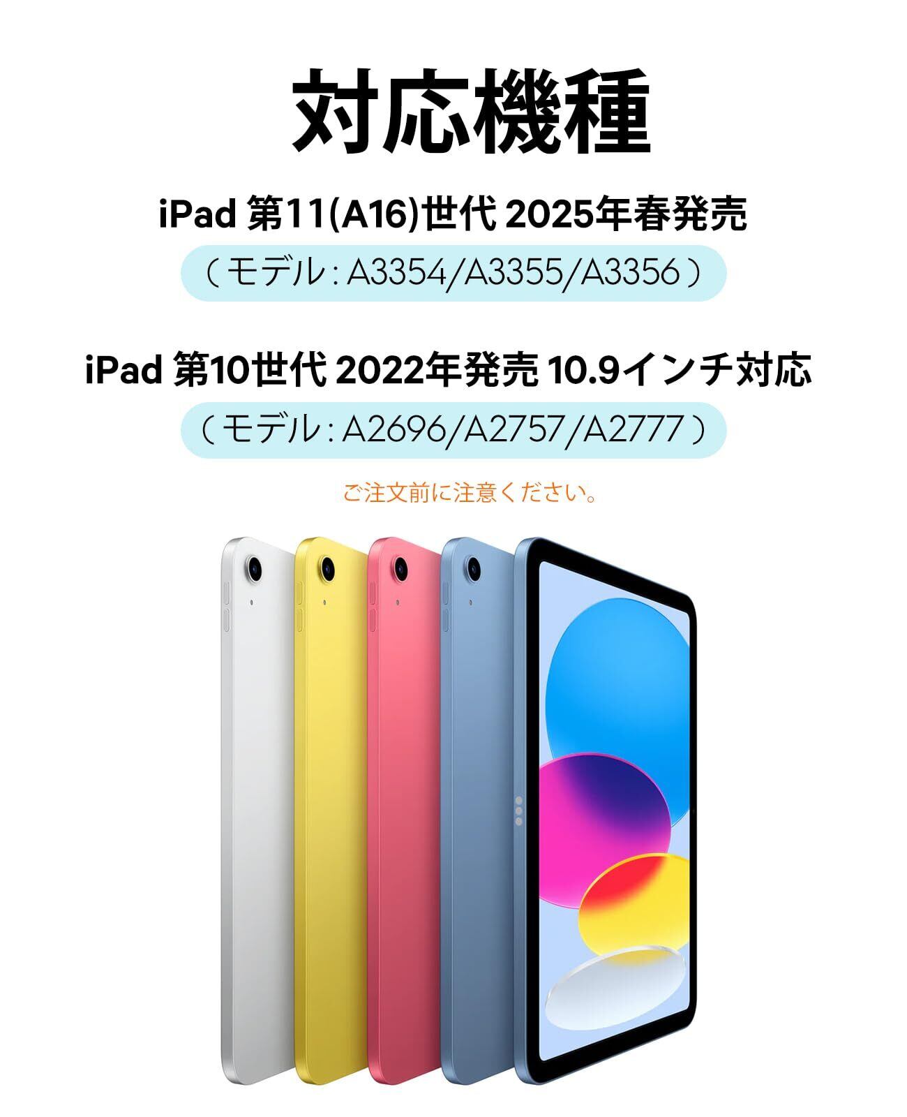 【互換性】10.9インチiPad第10世代2022年(モデル:A2696/A2777/A2757) ipad 11(A16)世代 2025年発売(モデル:A3354/A3355/A3356) 専用にカスタマイズされています。注意: 10.9インチiPad Air第5世代と第4世代とは互換性がありません。タブレットマグネットの位置が異なるため、キーボードに完璧に適応できない可能性があります。ご購入前に、背面のiPadモデル番号をご確認ください。