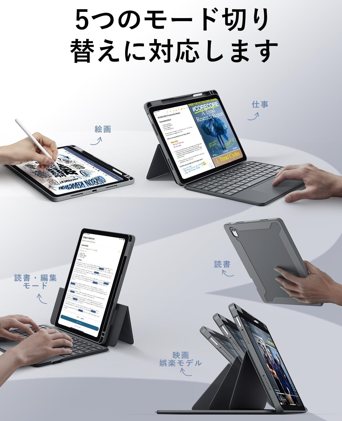 【マルチシーンモード】ipad 10世代 ケース キーボードは、使用ニーズに応じて、横モード、縦モード、または携帯モードを使用できます(キーボードカバーを取り外します)。iPad のグリップを良くするために、横モードまたは縦モードで使用する場合は、Apple Pen スロットが一番上または右にあることを確認します。