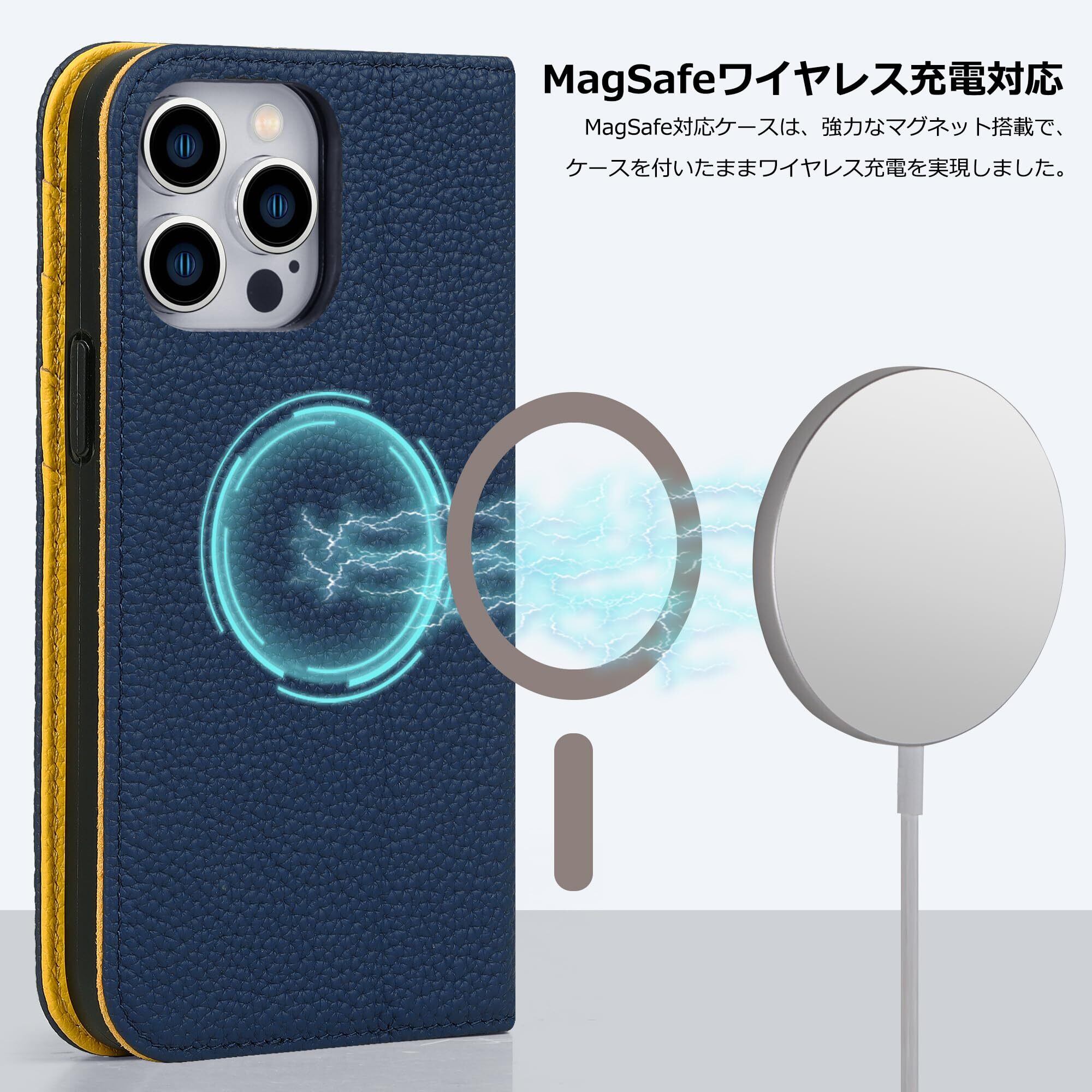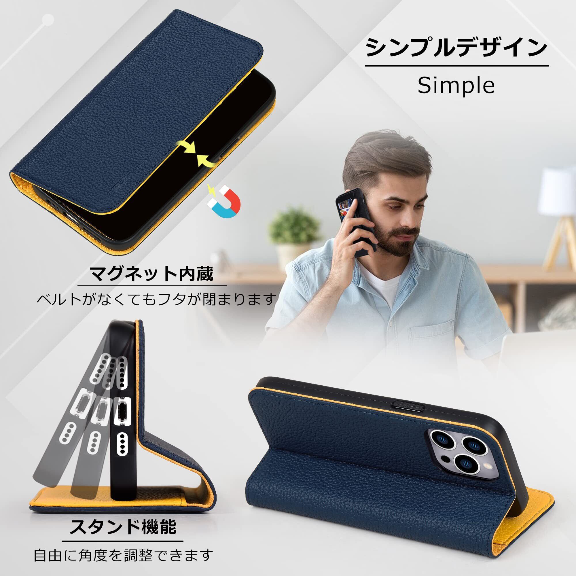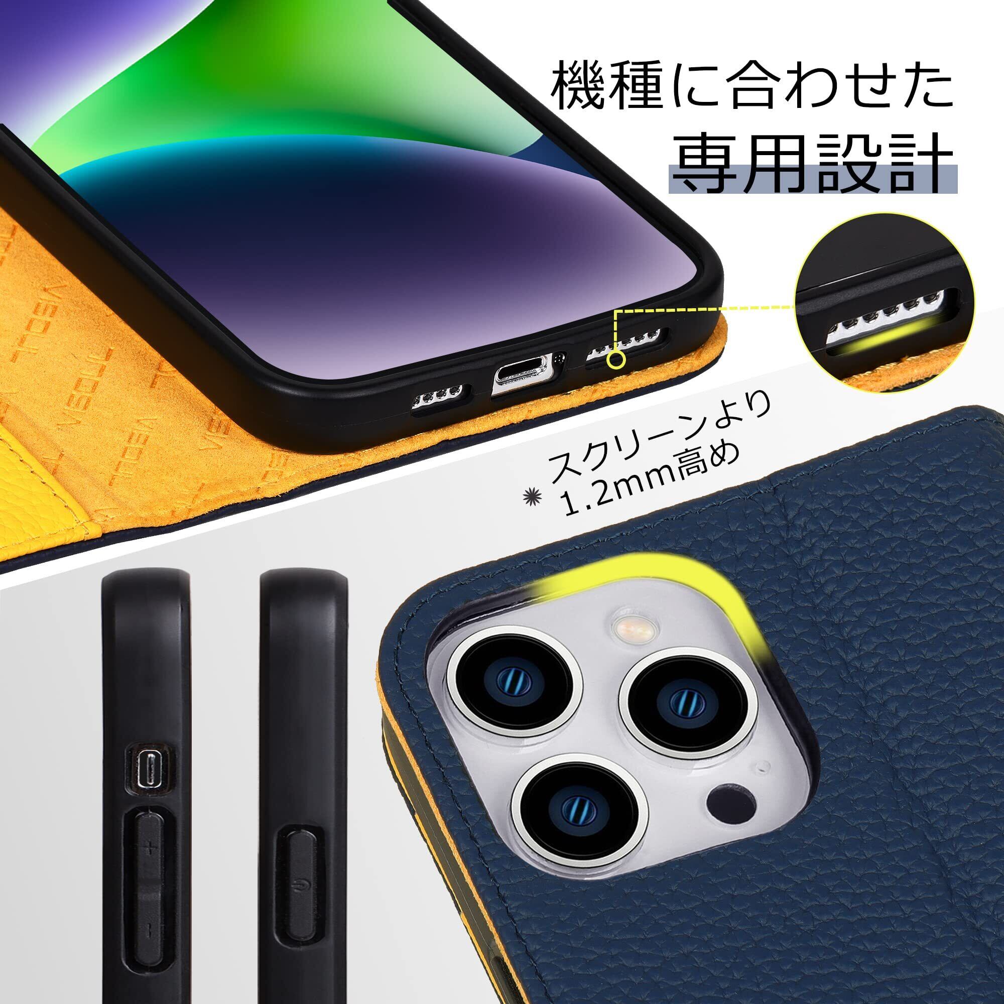 VISOUL iPhone 15 ProMax 対応 ケース 手帳型 本革 アイフォン15 ProMax レザーケース MagSafe対応 全面保護 マグネット式 カード収納 横置きスタンド 6.7インチ アイホン15 ProMax ネイビー レモン