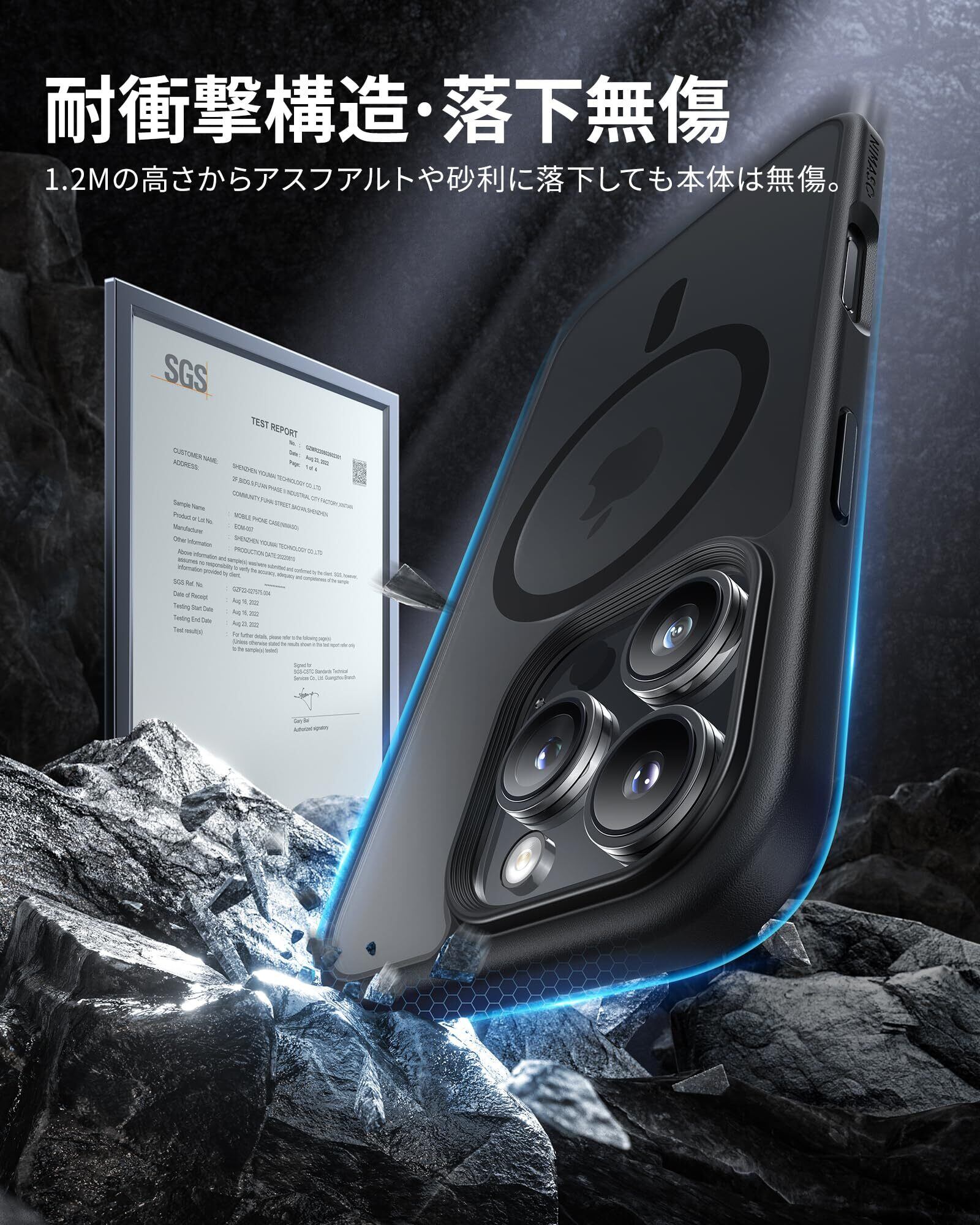 【米軍規格SGS認証・超強耐衝撃性】世界で有名な米国防総省が規定する米軍採用品規格「MIL-STD-810H」認証を取得済みです(認証番号:GZMR220802602301)。カバーの縁はスマホの液晶画面より1.4mm高く、カメラレンズより0.6mm高い、併用の保護ガラスフィルムで平置きしても画面は接触しない、細部までの保護も配慮され、より一層な安心感を与えられます。コンクリートの地面に厚さ5mmの合板を敷き、高さ1.2mから合計26回、違う角度から落下させる実験をしましたが、本体に傷はつきませんでした。高い耐衝撃性を誇り、スマホを全方位からしっかりと守ります。