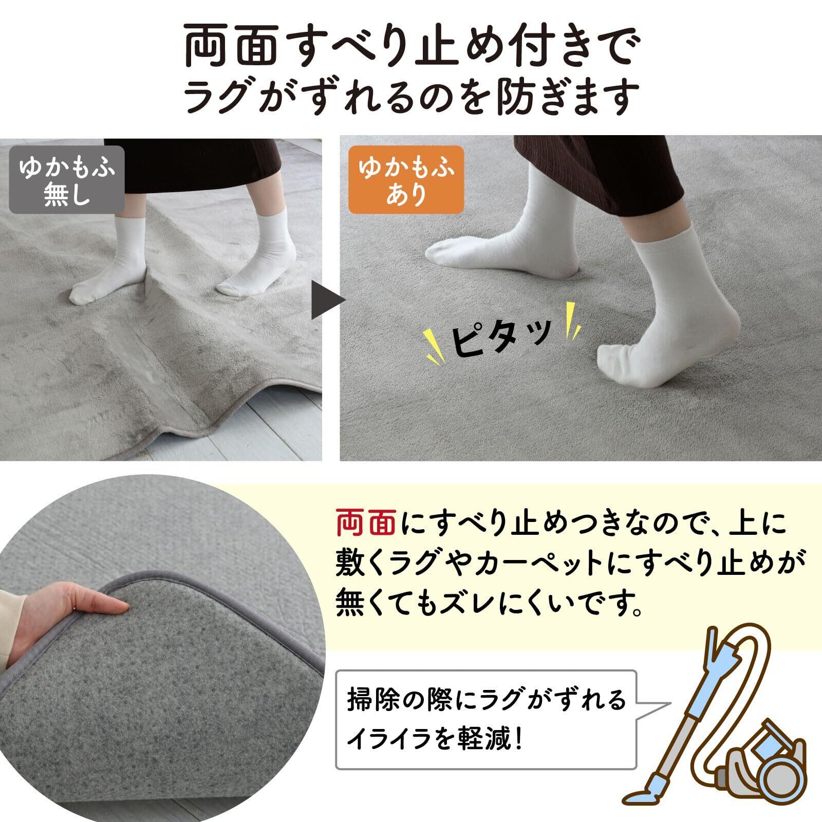 【すべり止め付き】両面にすべり止めがついているので、上に載せるラグにすべり止めがなくてもズレを防止できます。掃除の際や歩いたときにラグがずれるわずらわしさを軽減します。