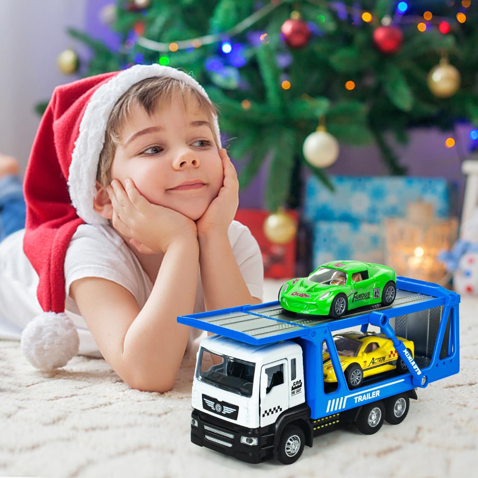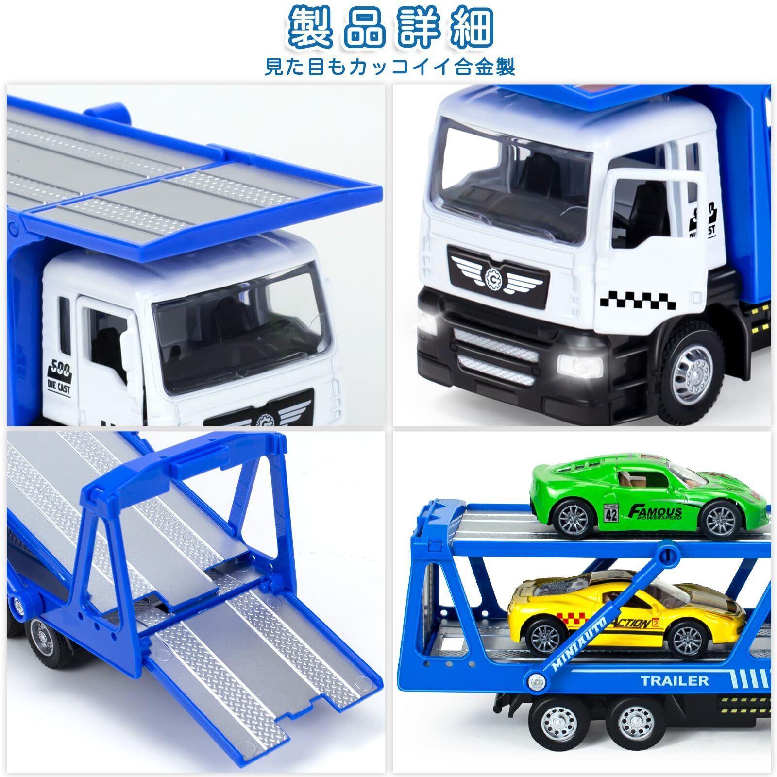 【プルバックカー】電池が車の中に付属して、大型自動車運搬車を押しながら後ろに引けてから放せるだけで、前に進みます。頑丈な合金を採用している車おもちゃで、高品質の材料を採用し、耐久性に優れています。小さな手に適した完璧なサイズです。6歳以上の子供に適しています。