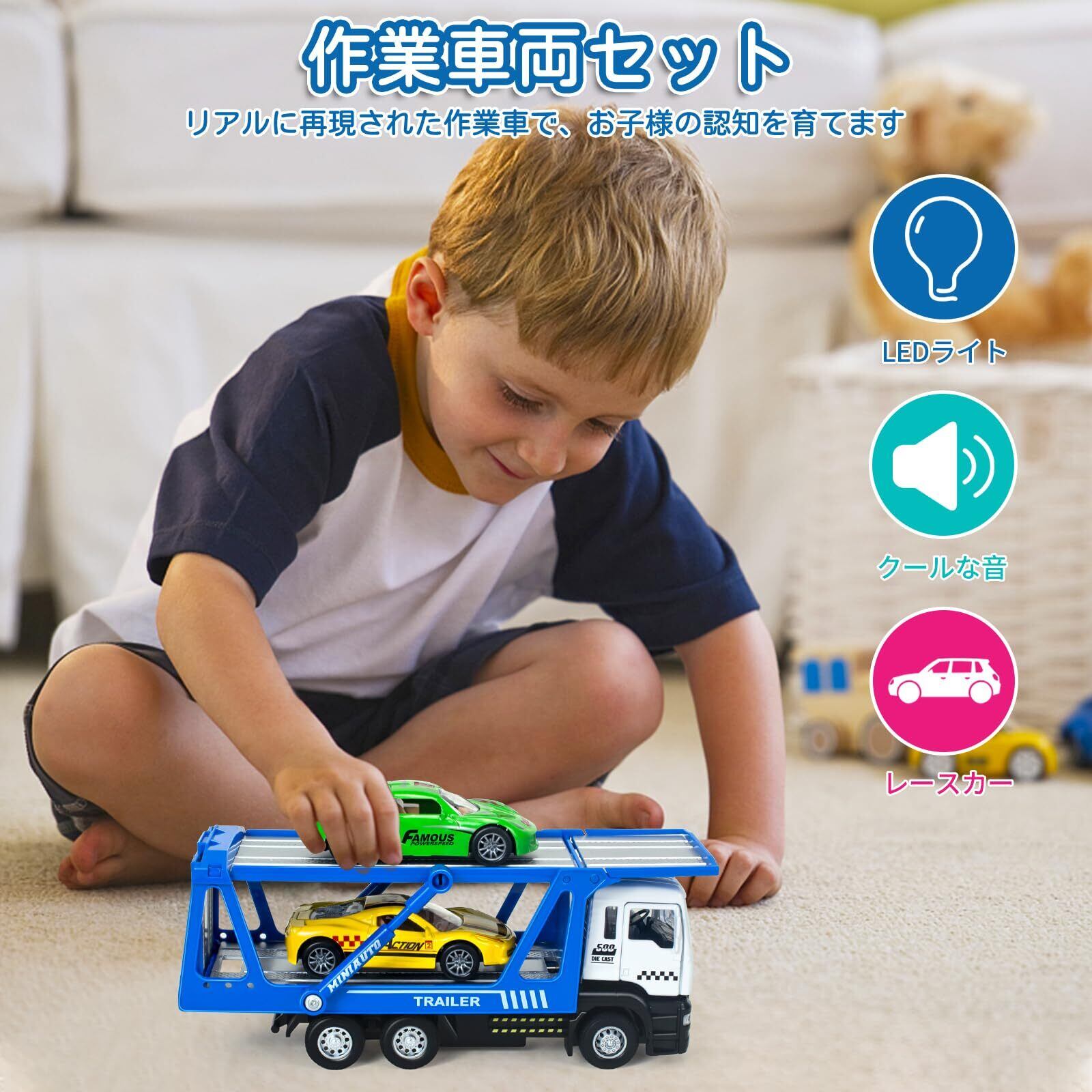 YongnKids 車 おもちゃ 1台収納車 2台ミニカーセット レッカー車 キャリアカー 子供 おもちゃ 建設車両 トラック トレーラー LED付き 合金製 丈夫 男の子 女の子 誕生日 クリスマス プレゼント 贈り物