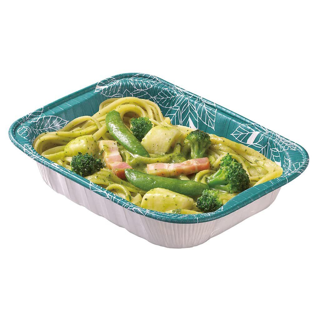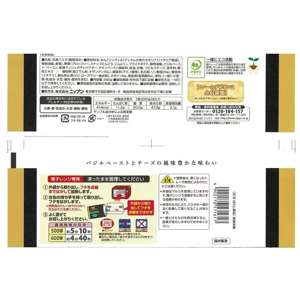 めん[リングイネ(デュラム小麦のセモリナ)(イタリア製造)、植物油脂、食塩]、野菜(ブロッコリー、スナップえんどう、にんにく)、フライドポテト、植物油脂、バジルペースト、ベーコン、乾燥マッシュポテトパウダー、チキンペースト調味料、食塩、砂糖、プロセスチーズ、香辛料、酵母エキス / 増粘剤(加工でん粉、キサンタンガム)、調味料(アミノ酸等)、乳化剤、リン酸塩(Na)、着色料(クチナシ)、酸化防止剤(V.C、ローズマリー抽出物)、カゼインNa、発色剤(亜硝酸Na)、香料、(一部に小麦・卵・乳成分・大豆・鶏肉・豚肉を含む)