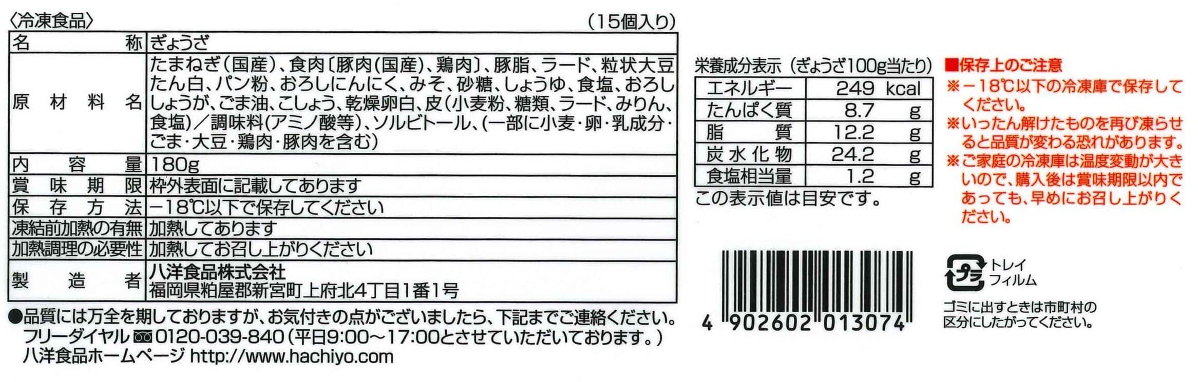 たまねぎ(国産)、食肉〔豚肉(国産)、鶏肉〕、豚脂、ラード、粒状大豆たん白、パン粉、おろしにんにく、みそ、砂糖、しょうゆ、食塩、おろししょうが、ごま油、こしょう、皮〔小麦粉(国内製造)、米粉、糖類(麦芽糖、ぶどう糖)、みりん、食塩〕/加工デンプン、調味料(アミノ酸等)、ソルビトール、添付タレ(しょうゆ、醸造酢、果糖ブドウ糖液等、植物油脂、食塩、砂糖/調味料(アミノ酸等)、(一部に小麦・乳成分・鶏肉・豚肉・大豆・ごまを含む)