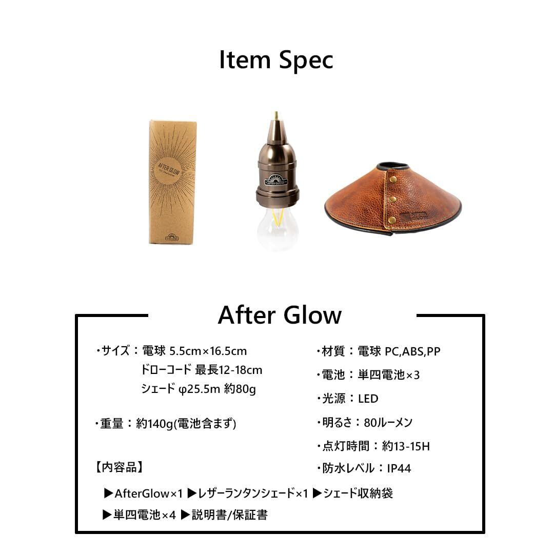 【優れる耐久性】キャンプギアとして開発された「AfterGlow」は、耐久性にもこだわりをもって設計致しました。 電球部分はスーツケースにも採用される、非常に耐久製の高い素材であるポリカーボネート製で万が一の落下があった場合にも割れる事がほとんどありません。