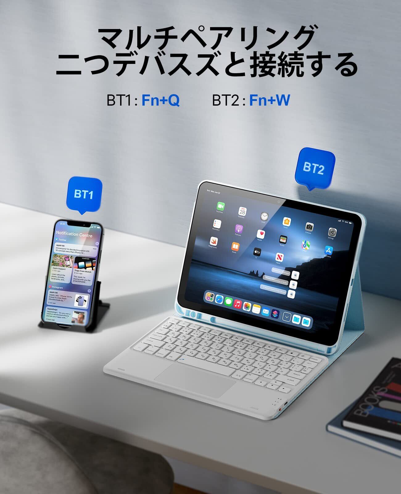【Bluetooth5.1&マルチペアリング2台切り替え】ipad 10世代キーボードケースはBluetooth5.1機能を搭載し、10メートル以内の伝送範囲で、データ転送速度と安定性も大幅アップすることが楽しめます。二つBluetoothチャネルがあるので、1台マルチペアリングキーボードでiPadやiPhone、ボタンを押すだけで自由に切り替えることができます。(Bluetooth接続のみをサポートします。)