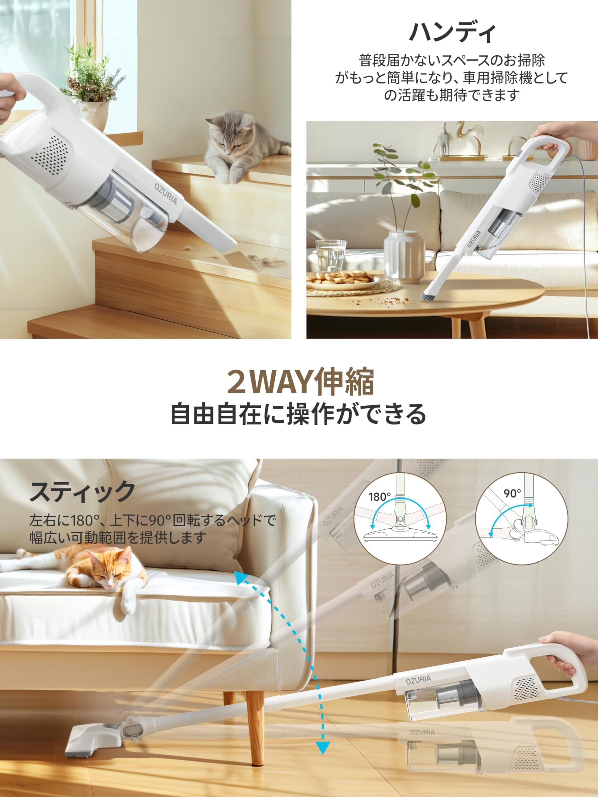 【2段吸引力 コード式掃除機初登場】 強弱切替 最大35000Pa Ozuria サイクロン 2WAY仕様 スティック掃除機 軽量 スティッククリーナー 多種類ノズル付き 遠心分離 5M電源コード 紙パック不要 ハードフロア/カーペット/カーテンに適用 PSE認証済み