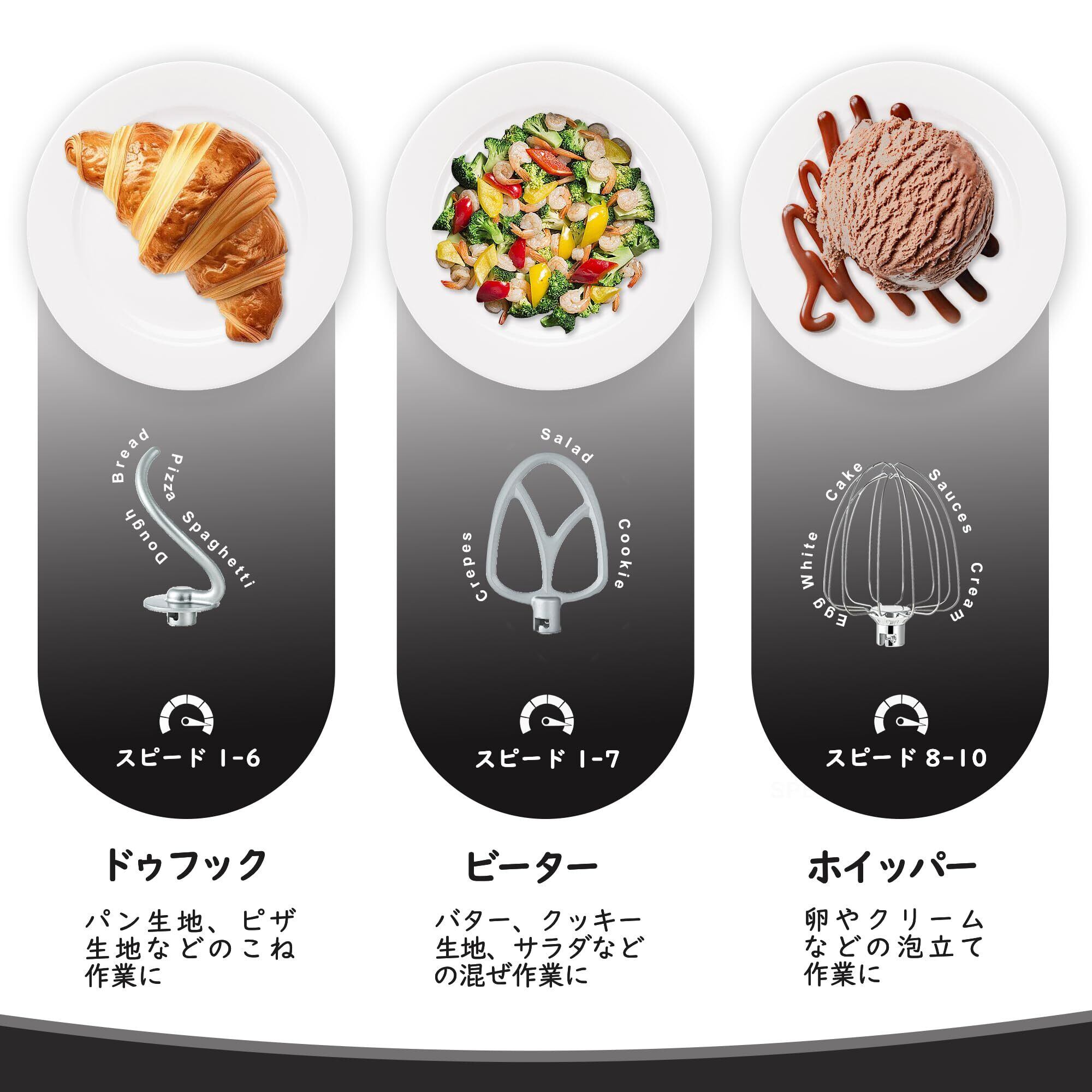 【多機能アタッチメントセット】付属のドゥフック、ビーター、ホイッパーで、パン生地のこね作業やケーキ作り、クリームの泡立ても手軽に実現。初心者からプロまで満足できる自由度の高い操作性をお楽しみください!