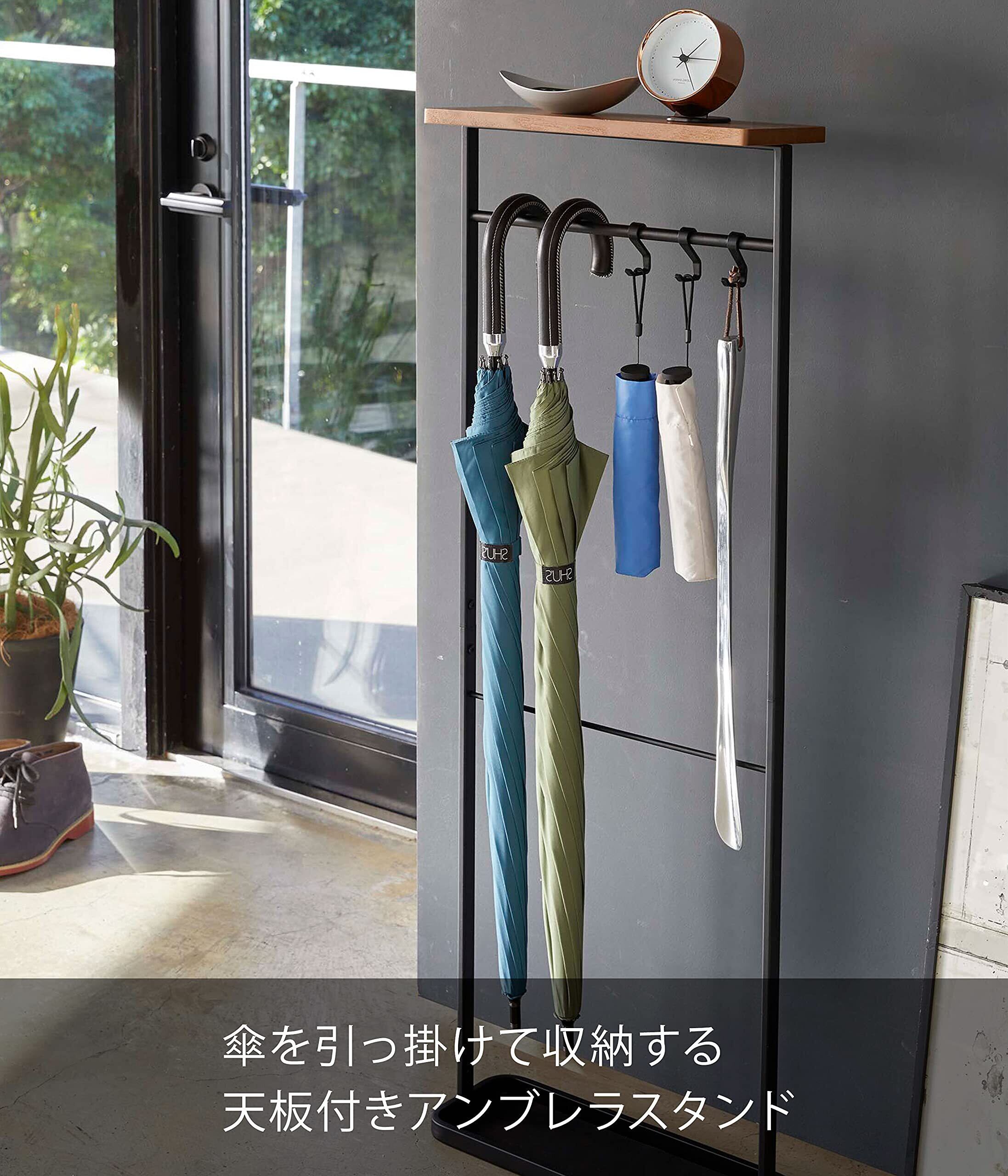傘を引っ掛けて収納する天板付きのアンブレラスタンド。