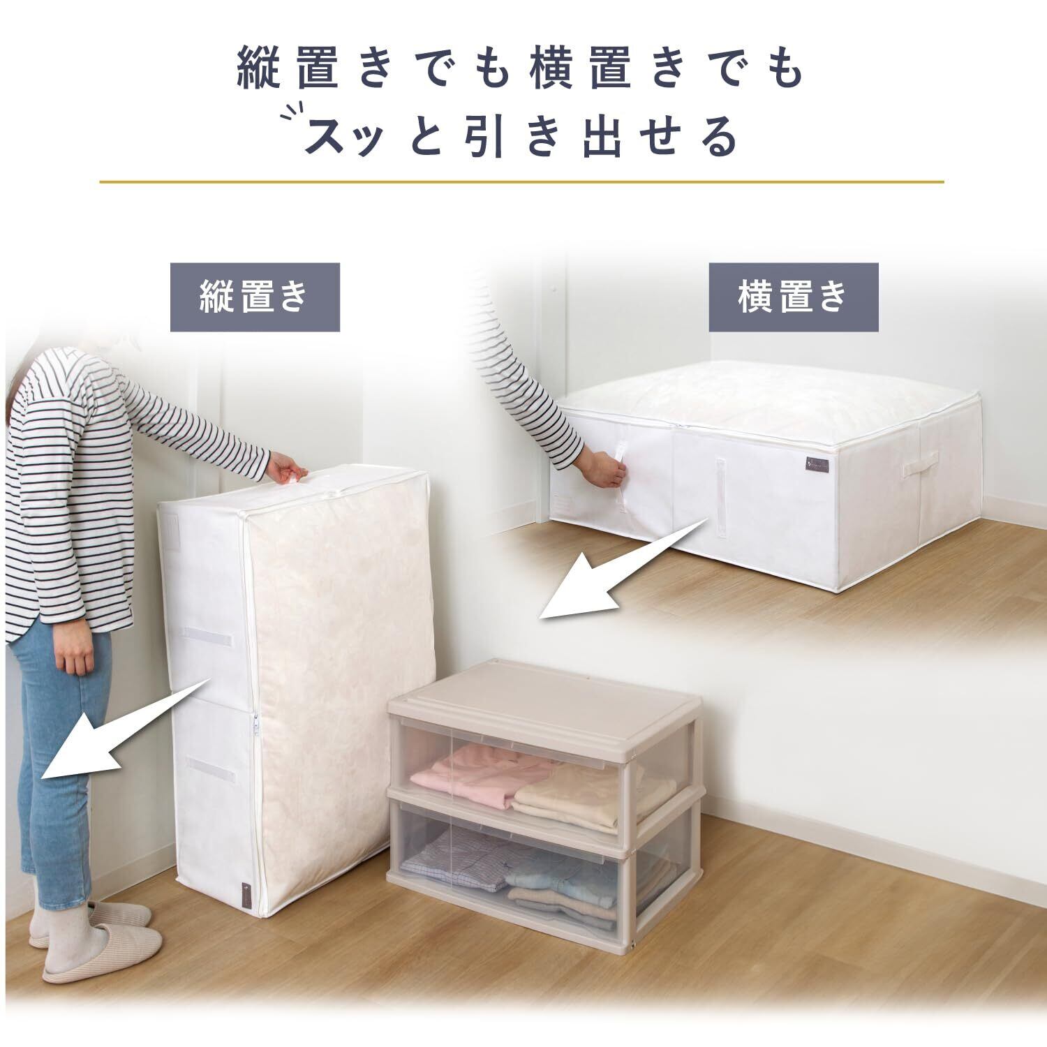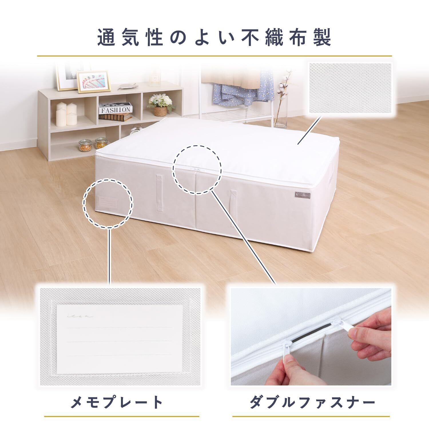 通気性が良くホコリを通しにくい生地のため、衣類や寝具の収納に適しています。