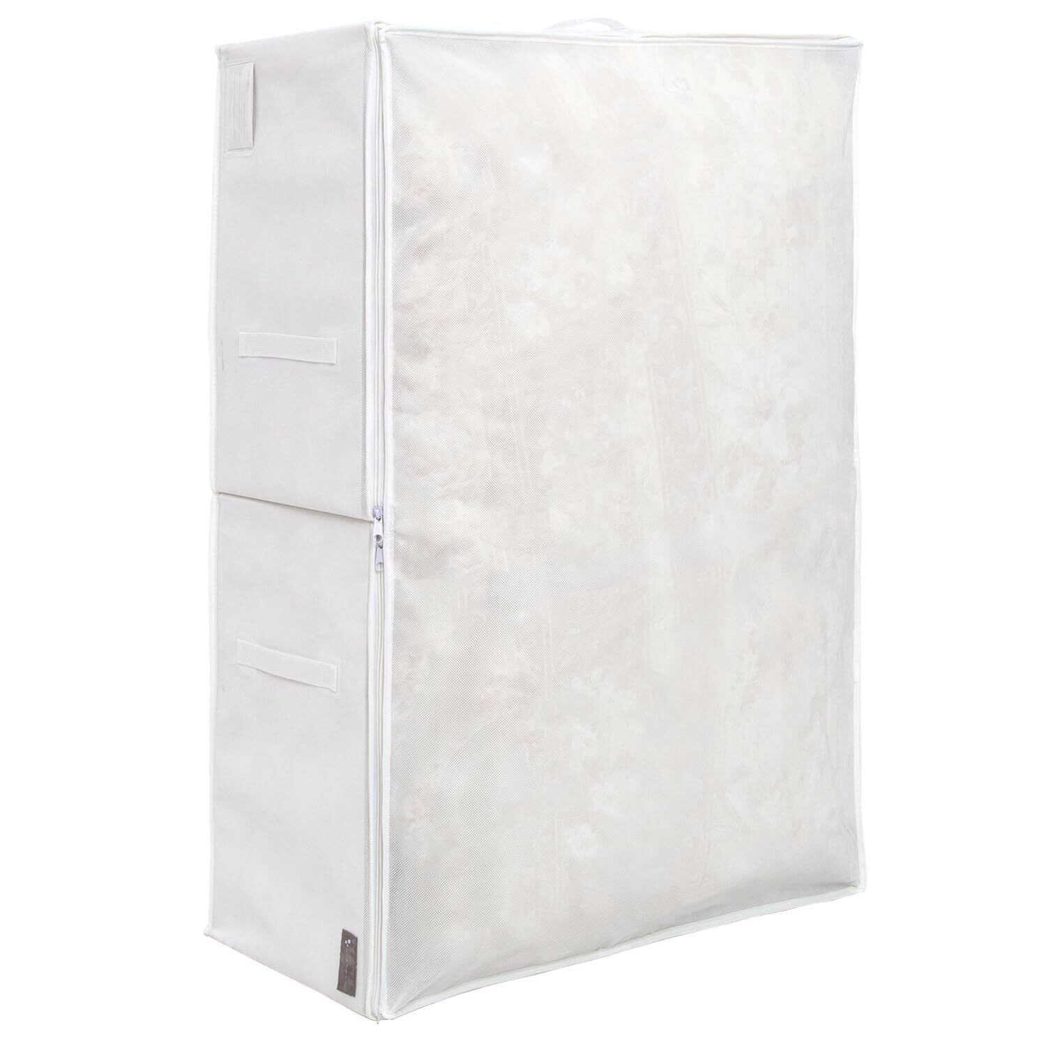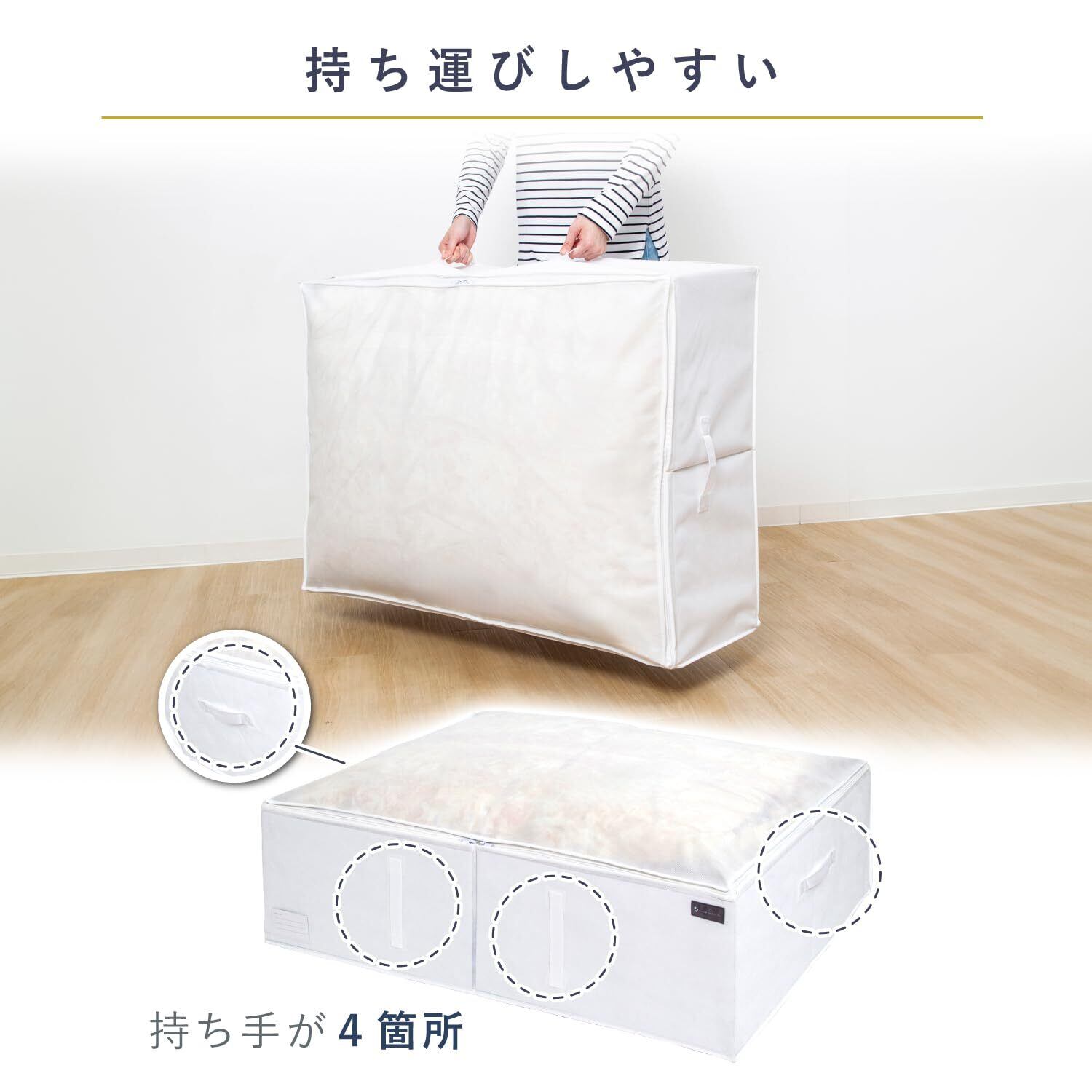 【通気性の良い不織布製布団一式収納ケース/白色でスッキリとまとまる】:通気性の良い不織布製の布団一式収納ケース。来客用の布団などをほこりから守り保管。収納スペースに合わせてさまざまな組み合わせで使用でき、白色でスッキリとまとまる。