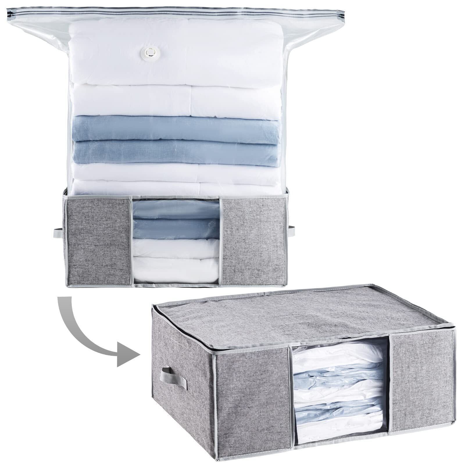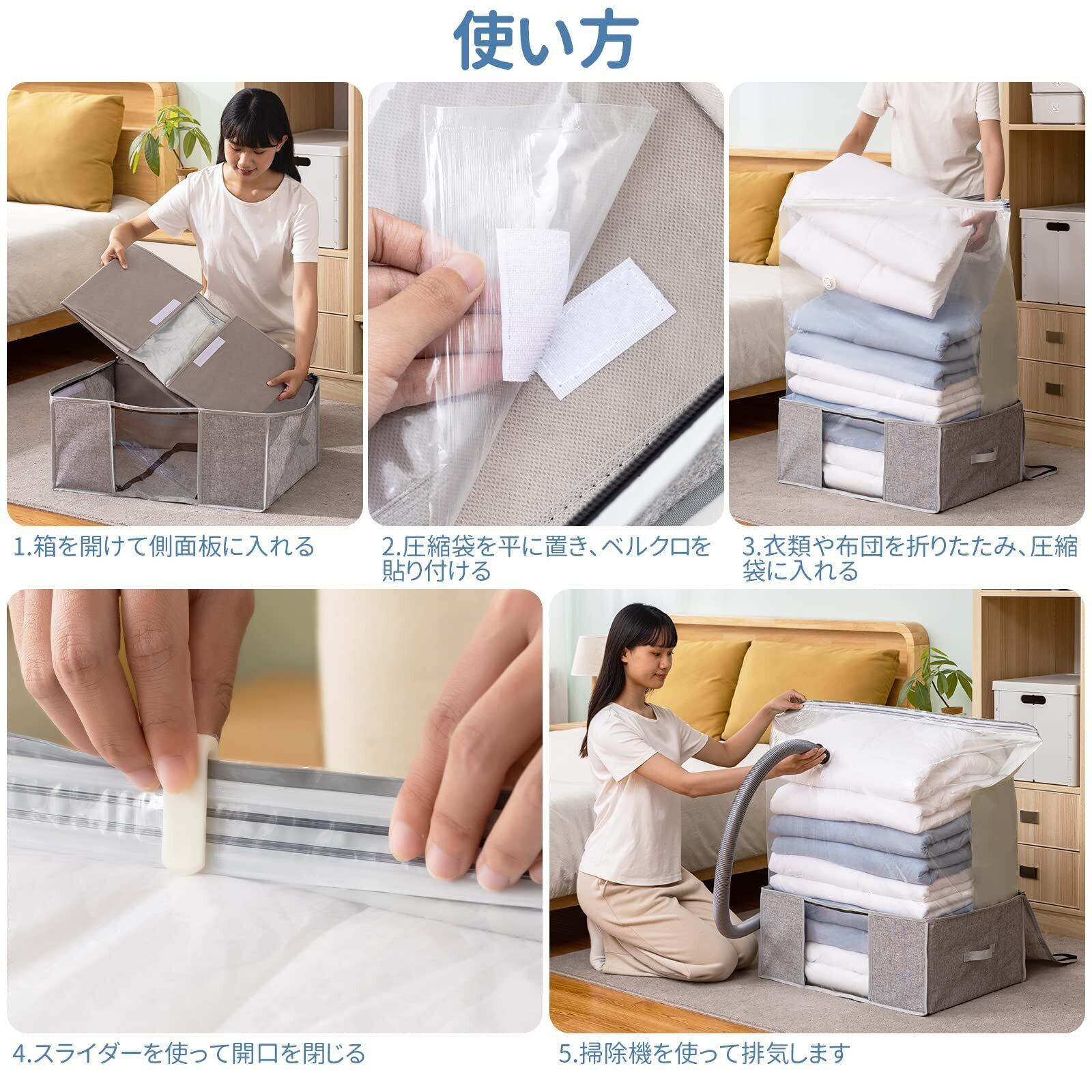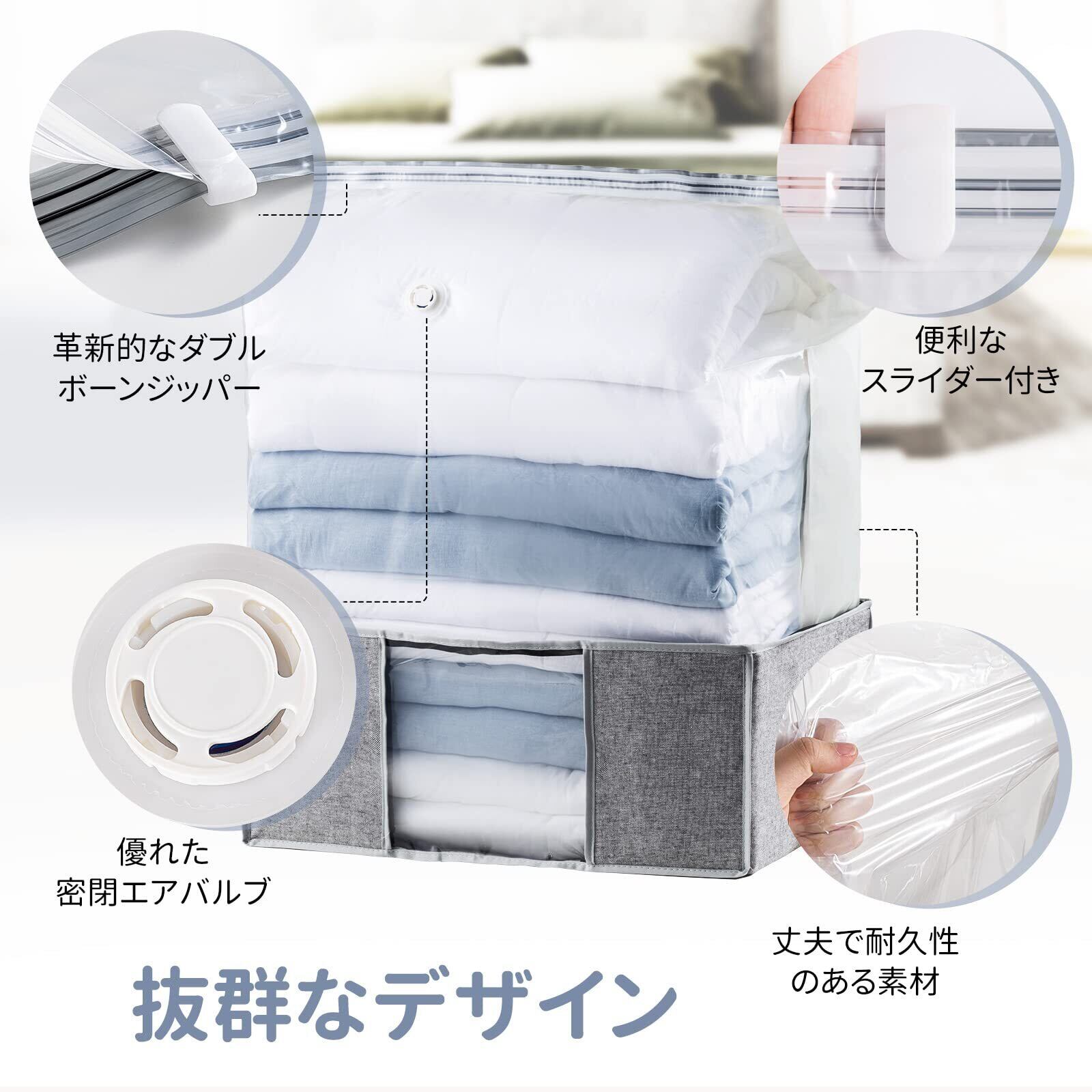 抜群な収納ボックス:収納ボックスの内部に丈夫なプレートが支えて、型が崩れにくくて、何個のボックスを積み重ねることができます。収納ボックスと圧縮袋がぴったりとフィットし、安定して変形しません。柔軟な素材で、丈夫で耐久性があります。革新的なエアバルブで、操作がより便利になります。圧縮バッグは一方向弁を採用しており、気密性があり、あらゆる掃除機に対応しています