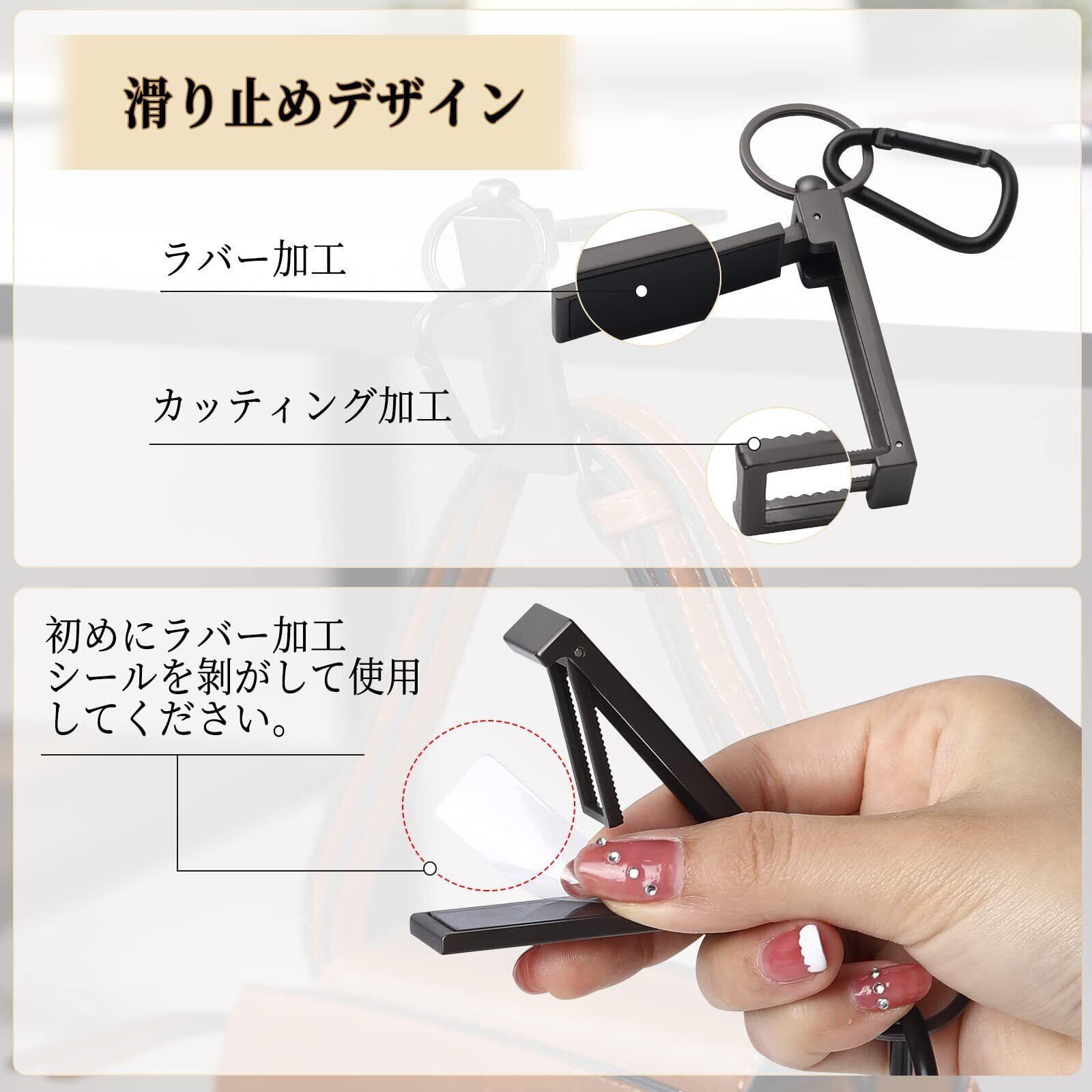 【滑り止め】フックの先端には滑り止めのラバーパッドが取り付けられています。( ※バッグを落としやすい原因は滑りフィルムが付いてました。‼バッグハンガーを使用前に、フィルムを剝がしてください。)これにより、滑りを防ぐだけでなく、家具の表面を摩耗から保護することもできます。さまざまなテーブルエッジ(厚さ4cmまで)に適用。 また、カラビナを使って、吊り下げることも可能です。