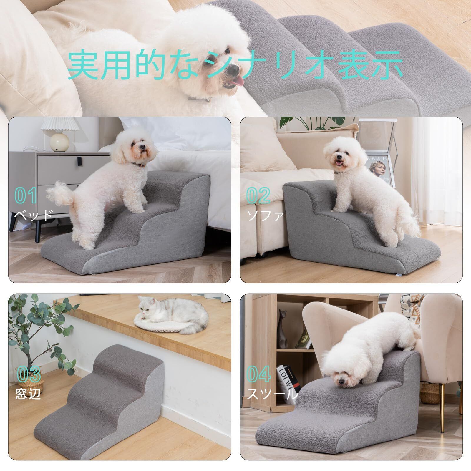 【小型犬用スロープ】-当社のペット用階段は従来のペット用階段と異なり、17°の快適な傾斜ステップのデザインを採用し、ベッドの上り下りが困難な犬により良い助けを提供し、関節に優しいです。