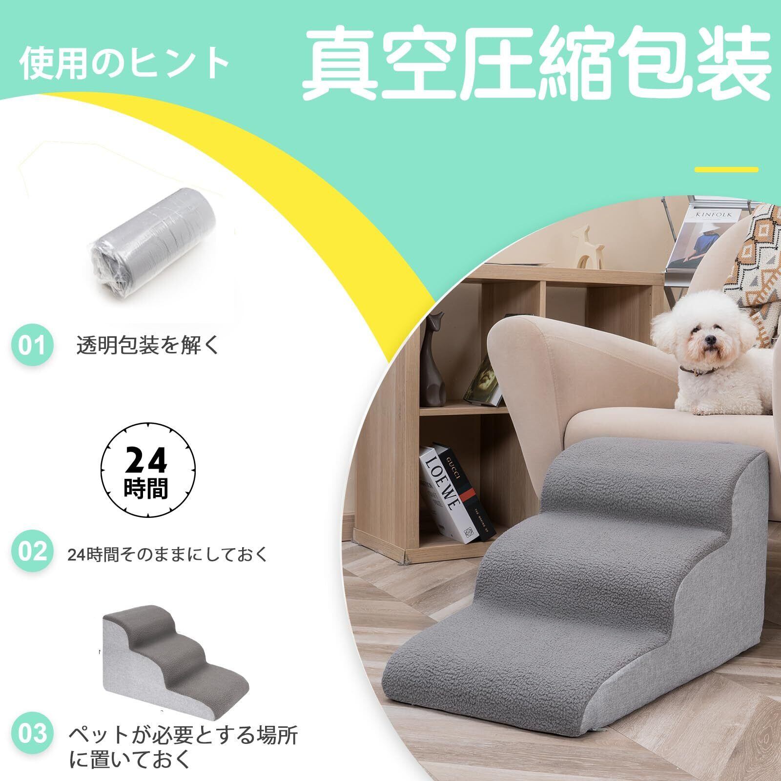【設置不要のペット階段】-商品が届いたら、真空包装を開けるだけで、当社の犬用階段の高密度スポンジが自動的に膨張し、一般的に、24時間後に完全に反発することができ、設置する必要はありません。