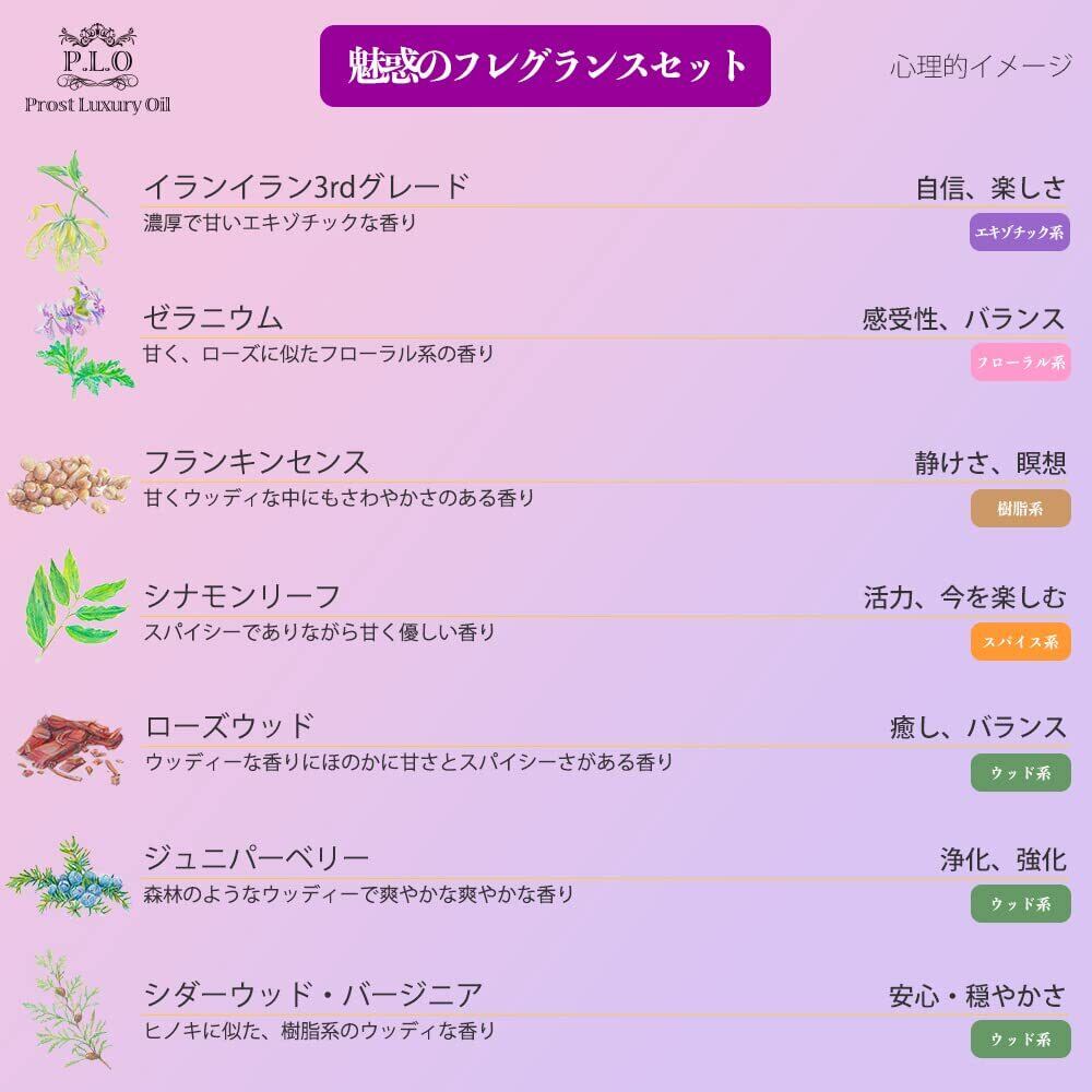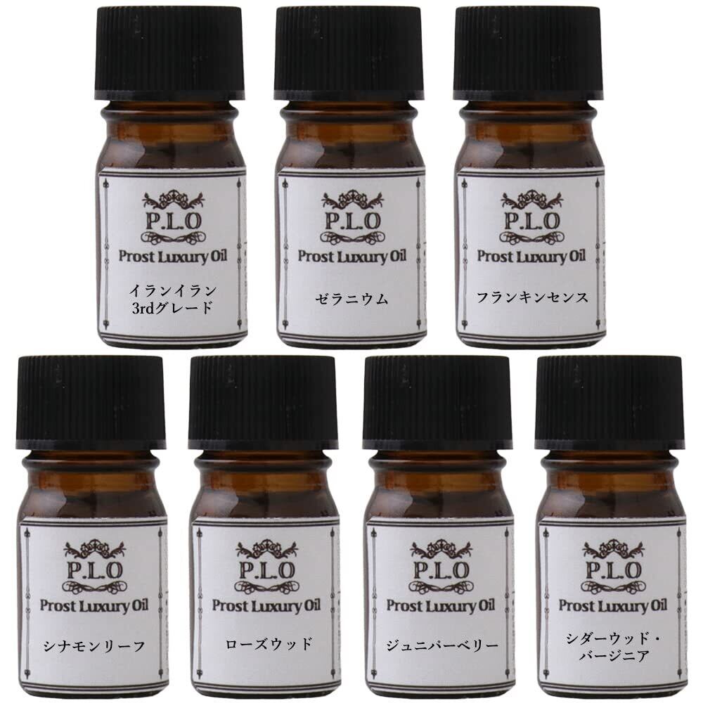 魅惑のフレグランスセット Prost Luxury oil ピュアエッセンシャルオイル 1.イランイラン3rd 2.シダーウッドバージニア 3.ジュニパーベリー 4.ローズウッド 5.シナモンリーフ 6.ゼラニウム 7.フランキンセンス 合計:2ml ×各1本