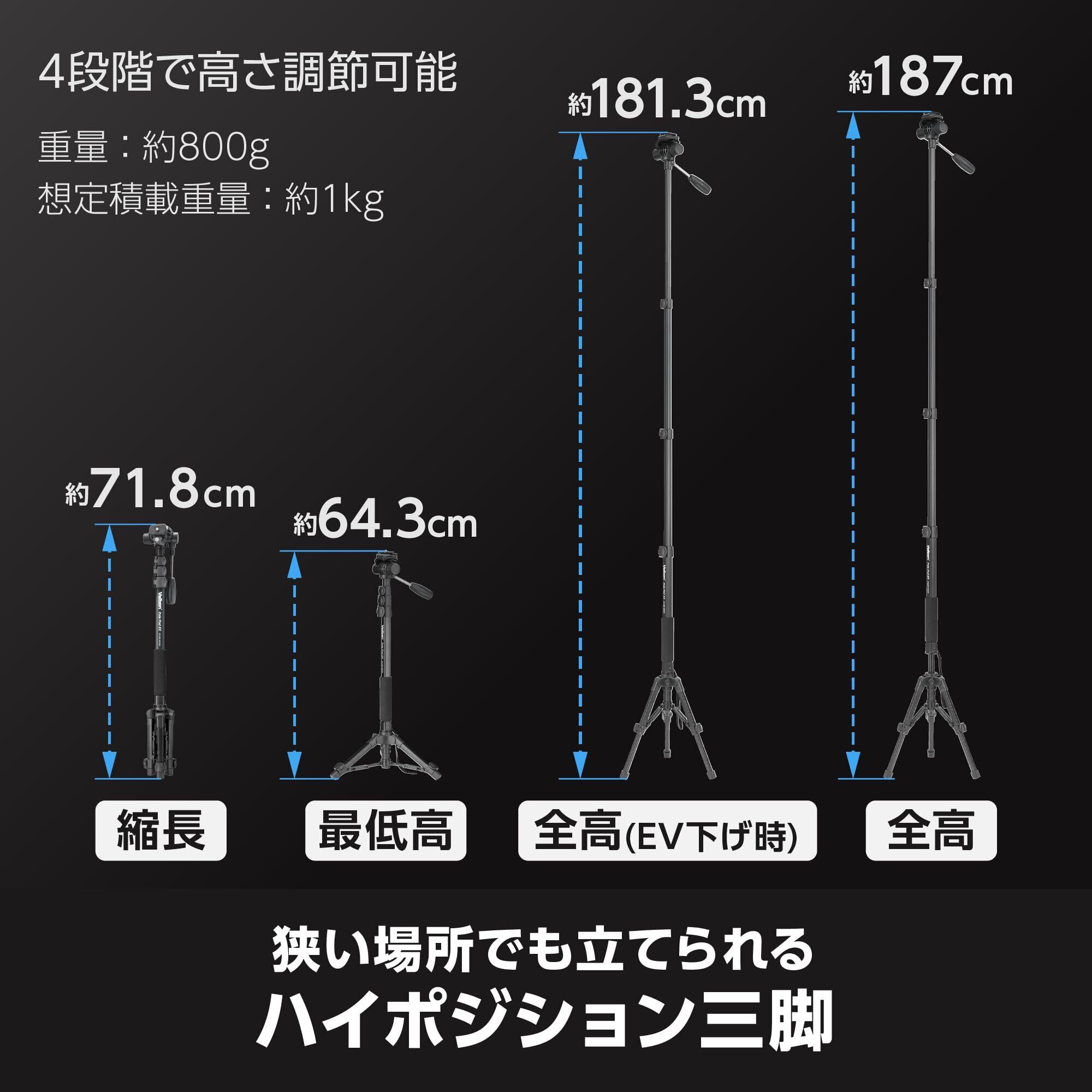 全高(EV含む):1870mm、縮長:718mm、脚径/段数:ポール23mm4段・脚部17mm2段、質量:848g