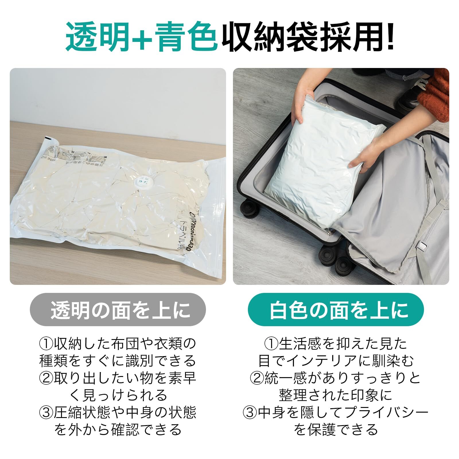 [中身を目隠しすることが可能]片面が非透明の青色で、中身を目隠しすることが可能。人目を気にせずに荷物を出し入れしやすいため、旅行やアウトドアの荷造りにも便利です。加えて、裏面が透明なので、ひっくり返せばひと目で中身を確認できます。