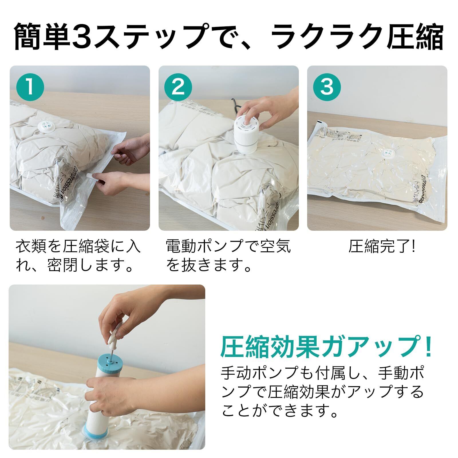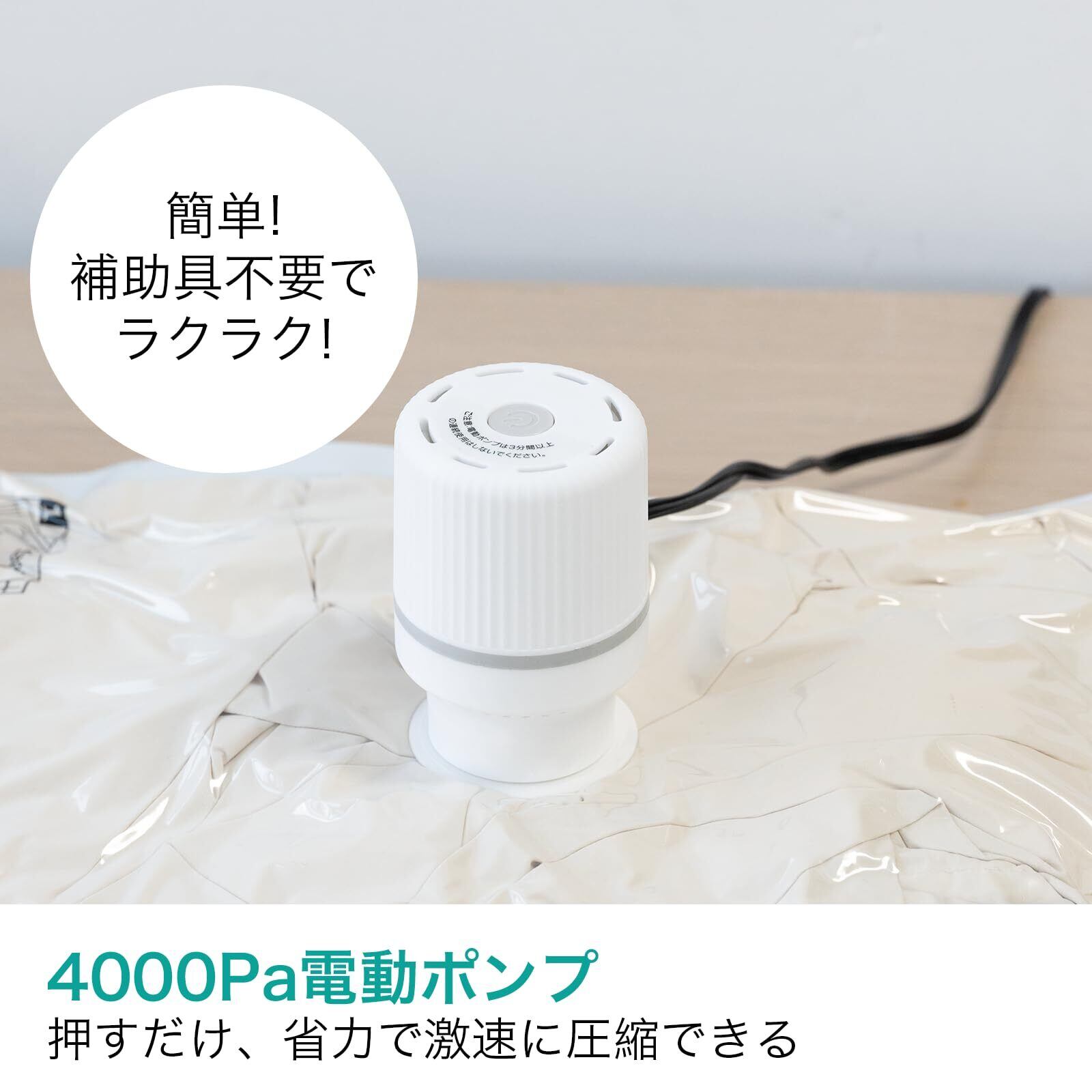 [電動吸引ポンプつきで短時間で収納できる]電動吸引ポンプつきで簡単に空気を抜くことができ、瞬間的に80%圧縮できます。また手動吸引ポンプも付属、手動吸引ポンプを合わせ、最後まで圧縮力をアップ!