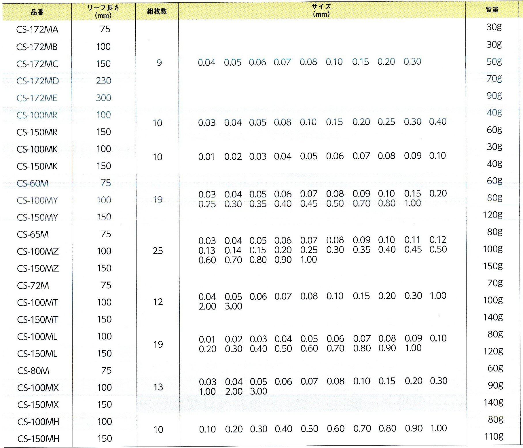 サイズ(mm):0.01 0.02 0.03 0.04 0.05 0.06 0.07 0.08 0.09 0.10 0.20 0.30 0.40 0.50 0.60 0.70 0.80 0.90 1.00