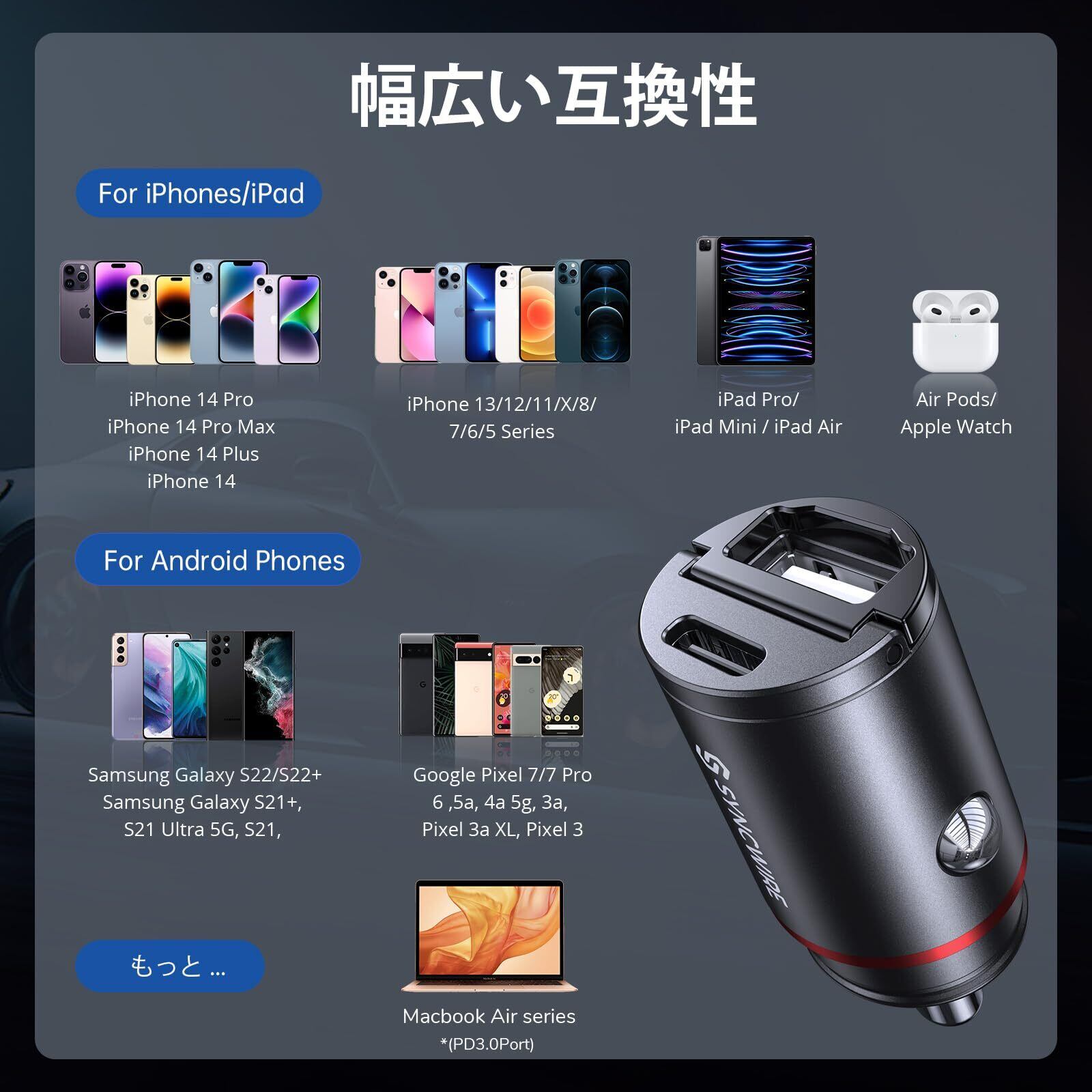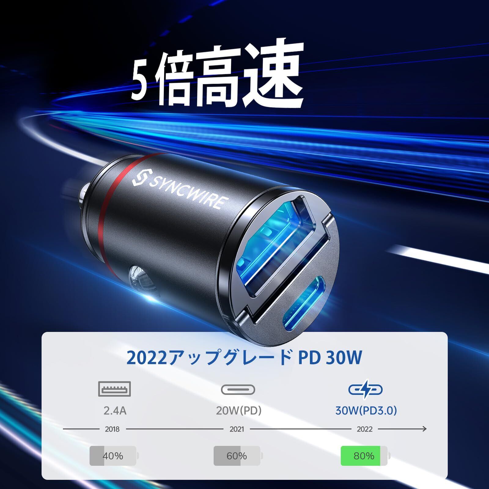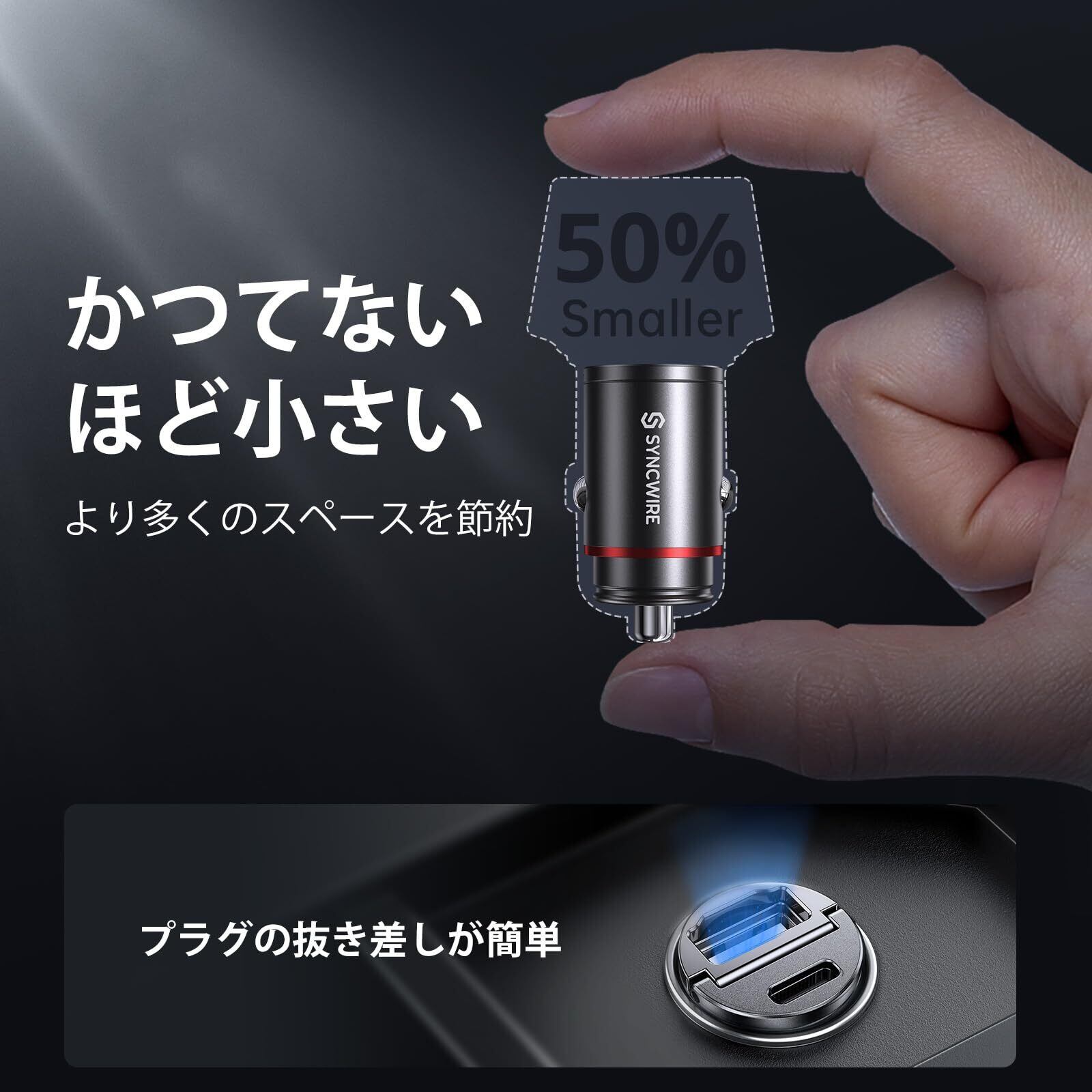 【業界極小サイズ】Syncwire シガーソケット USB & USB C カーチャージャー 2ポート【PPS 30W対応 PD 30W QC3.0/超急速充電/全金属/軽量】 Type C カーチャージャー 12V/24V車対応 出っ張らない しがーソケット USB 車載充電器 iPhone 16/15/14/13/SE/12/11/X/8 Xperia Samsung iPadなどに対応