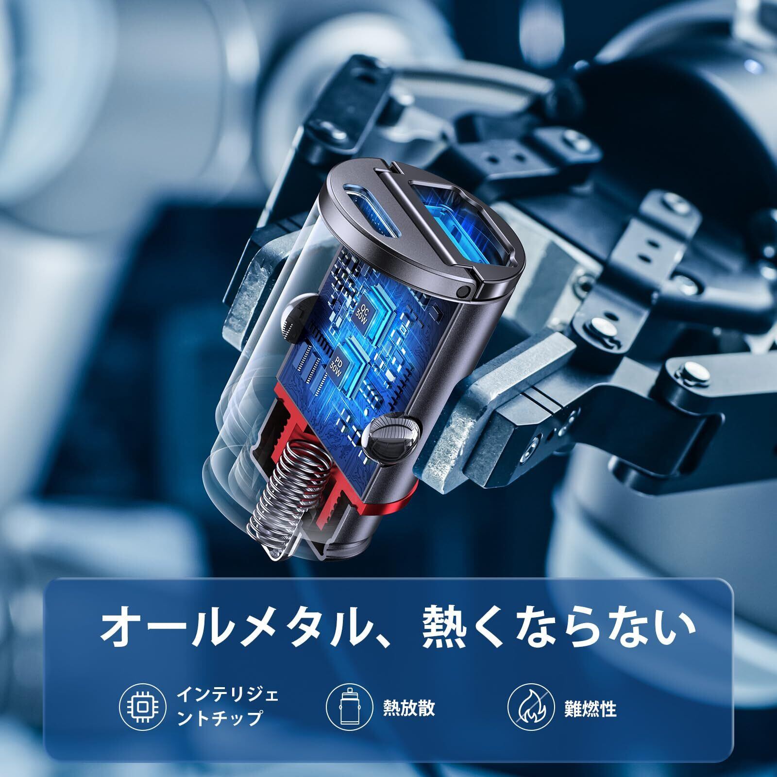 【小型設計で高級感あるデザイン】 省スペースな超コンパクト設計なので車内でも邪魔にならずに充電することが可能です。本体の素材にはキズがつきにくく軽くて丈夫なアルミ合金が採用され、重さはわずか17gほどの超軽量。高級感を感じさせるデザインと質感で、メタリックブラックのカラーリングが車内のインテリアにもぴったりとマッチします。(2022年12月までに世界最小)