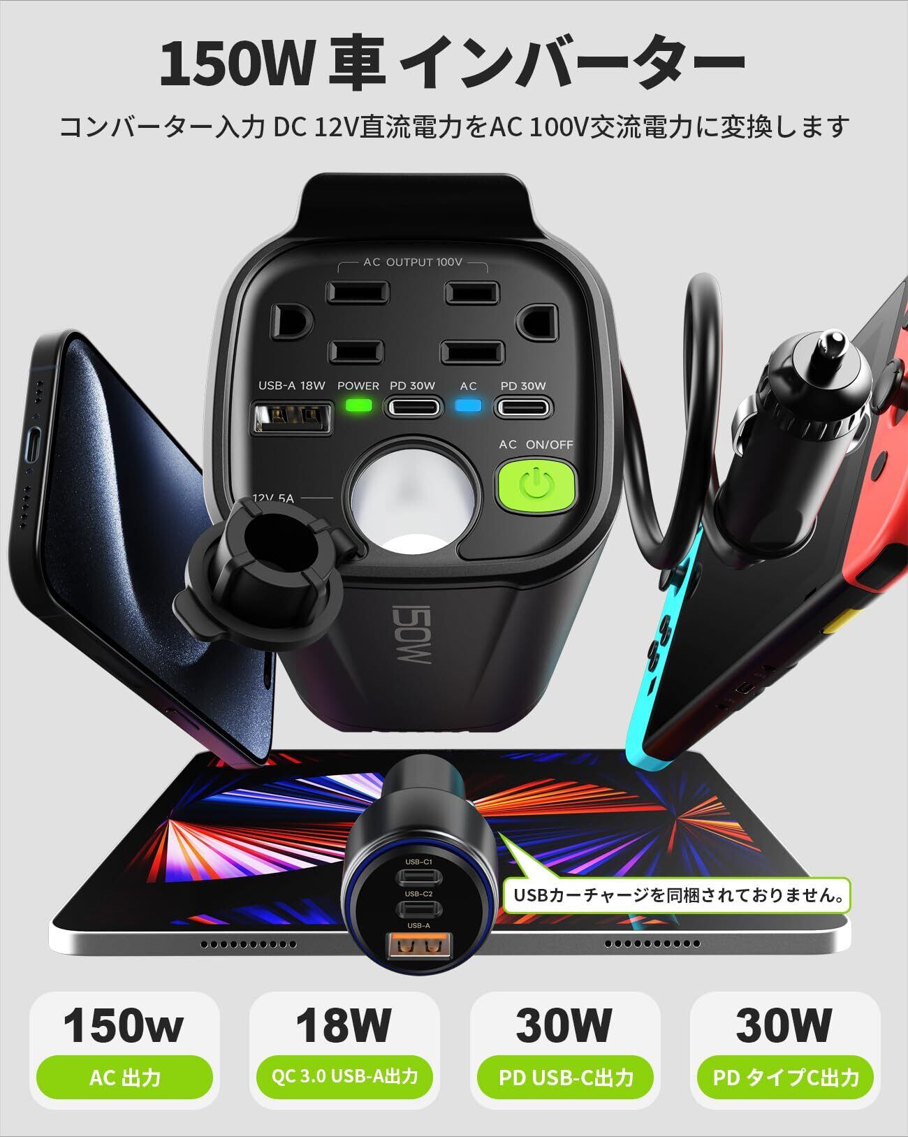 【マルチデバイス充電ステーション】当商品はAC150W出力可能なカーインバーターです。 車内のDC12V電源をAC100V電源に変換し、車内で小型家電、ゲーム機、スマホ、ラップトップ様々な電子機器などの電力を消費する機器に同時に十分な電力を供給できます。 出張、旅行、キャンプ、車内作業、停電、地震災難時などに欠かせない自動車アクセサリーです。