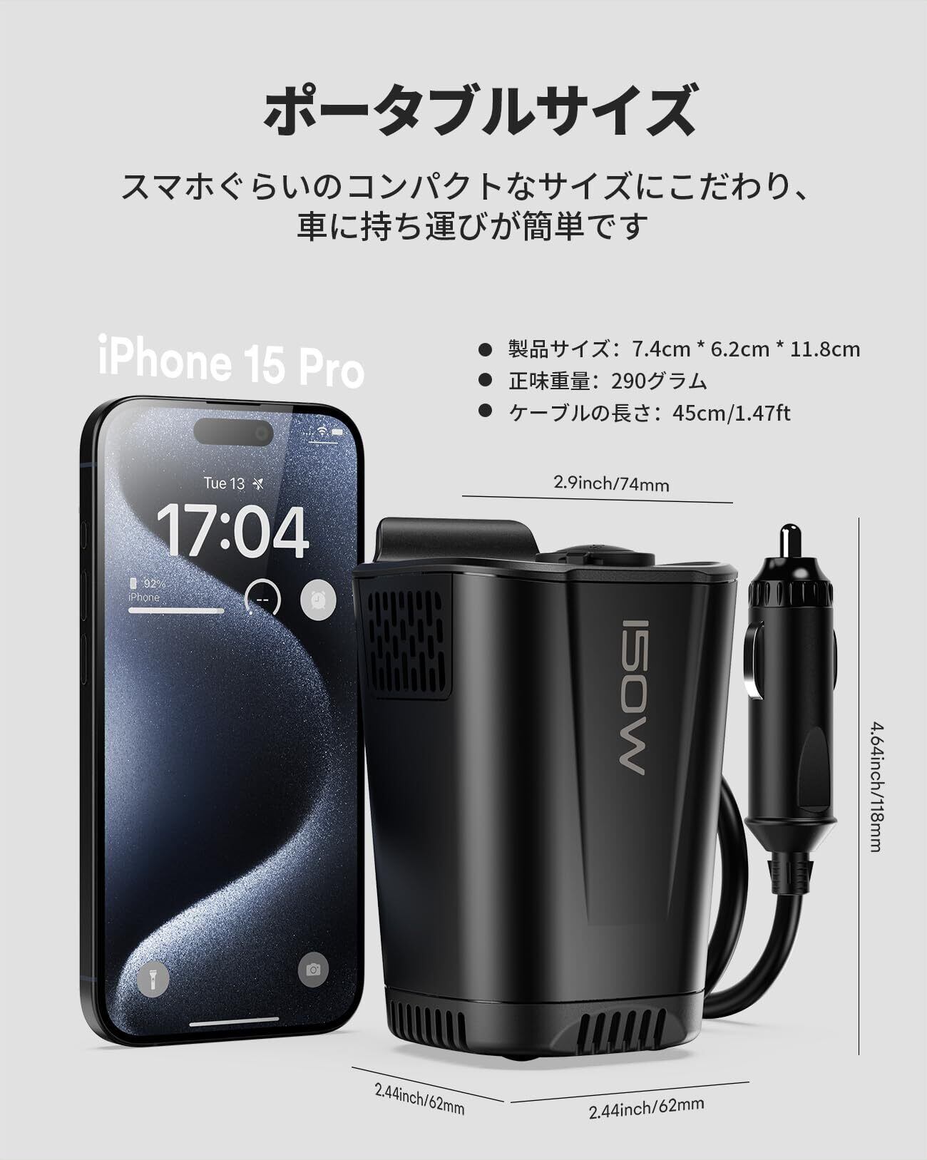 【コンパクトで省スペース】寸法:7.4cm*6.2cm*11.8cm、重量:290g。クラシックなブラックのデザインは、車内に完璧に調和します。 コンパクトなボディは車のカップホルダーに簡単に収まり、車の中央に配置されているため、車のシガーライターへのアクセスや後部座席での電子機器の接続が簡単です。