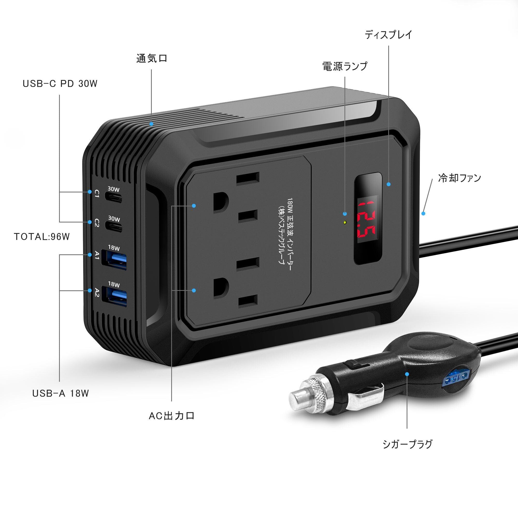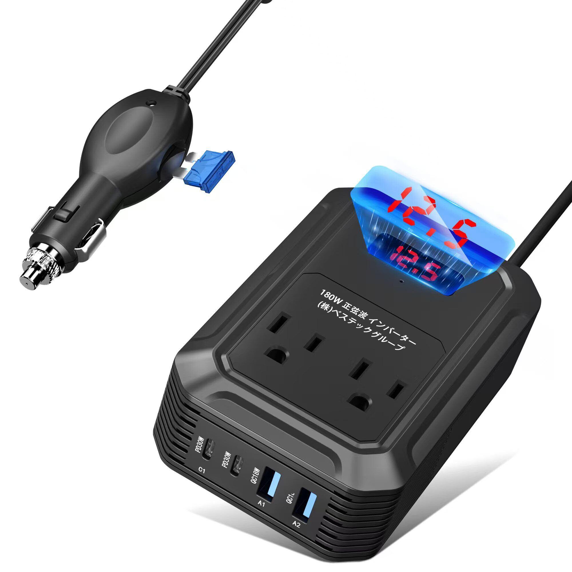 BESTEK インバーター 180W 正弦波 ・ クリップ正弦波 「業界初売り」 シガーソケット コンセント 12V to 100V 車載用 急速給電 カーインバーター USB-C PD 30W/ USB-A QC 18W 合計4ポート コンバーター 車アクセサリー カーチャージャー MRZ1810EU-BK