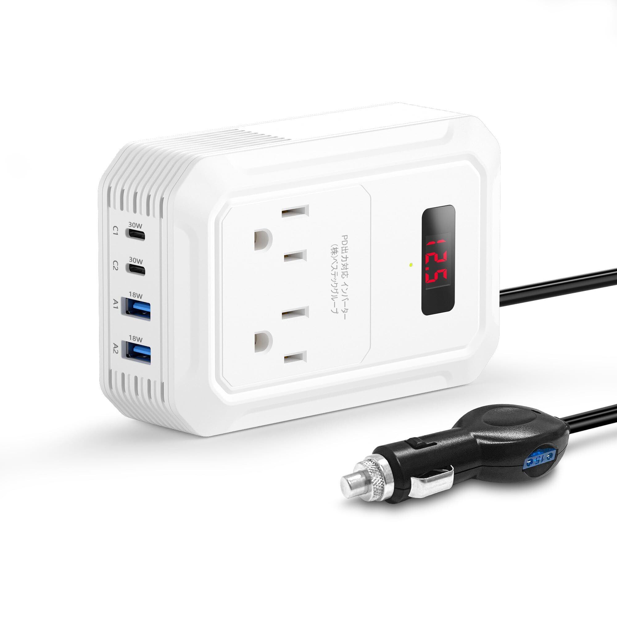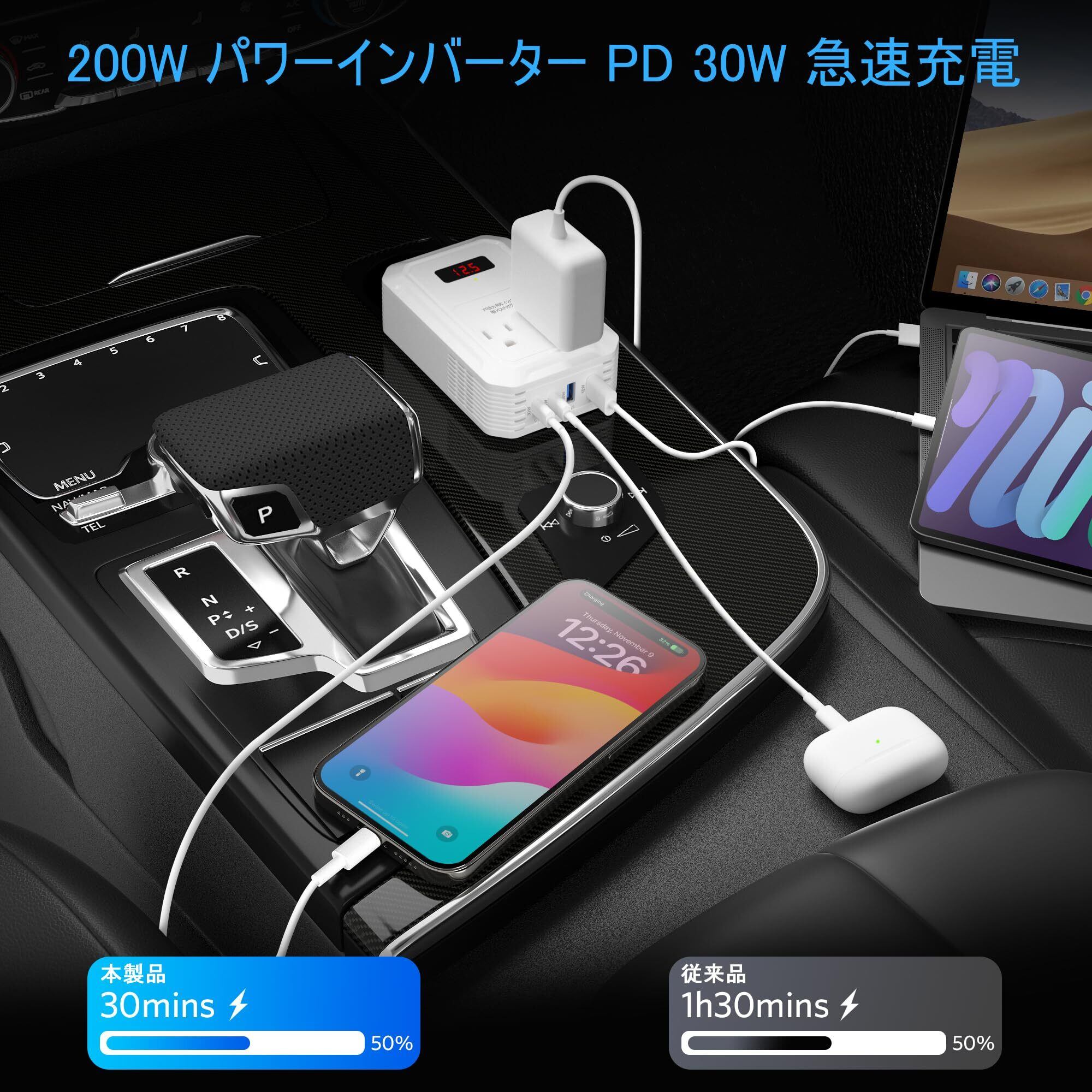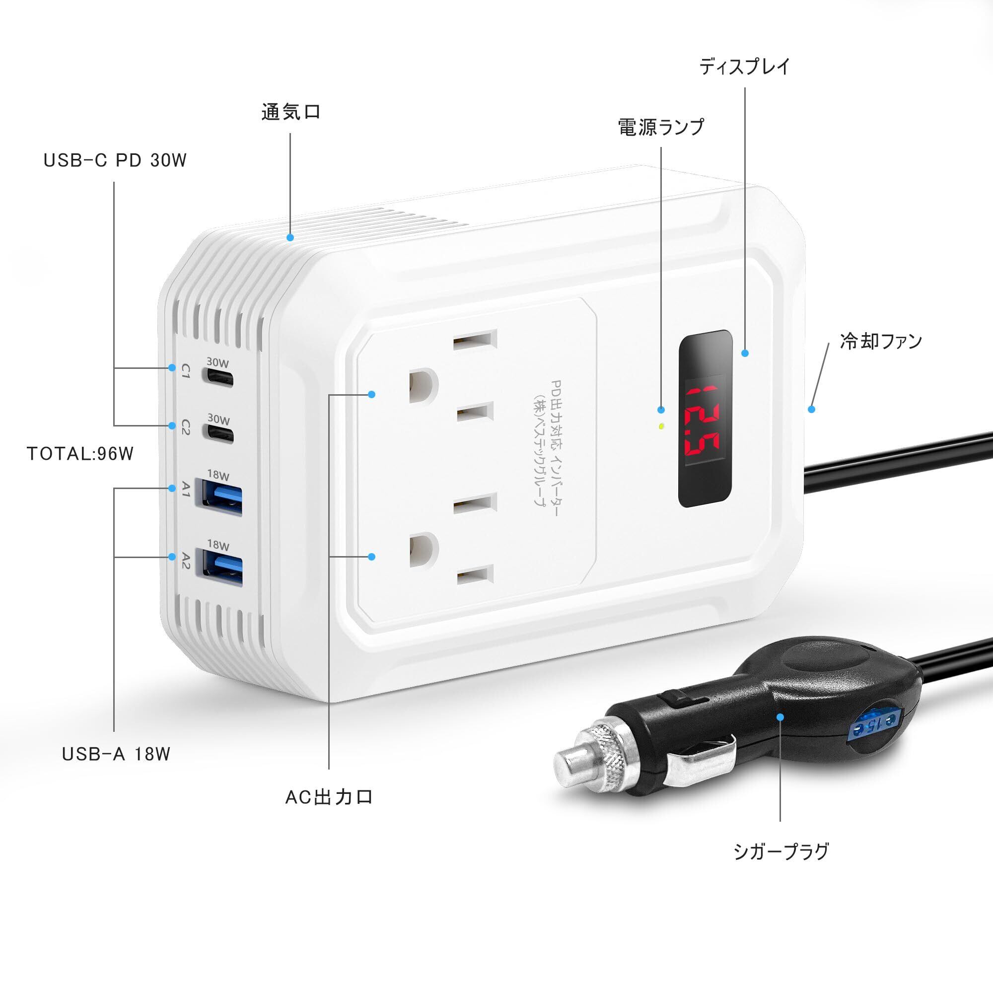 BESTEK インバーター シガーソケット コンセント 200W 修正正弦波 PD 出力対応 カーインバーター DC12VをAC100Vに変換 急速給電: USB-C PD 30W 2ポート USB-A QC 18W 2ポート 合計 4ポート カー用品 電圧測定機能搭載 電圧計 バッテリーチェッカー として使用可能 白 MRI2010EU-WH