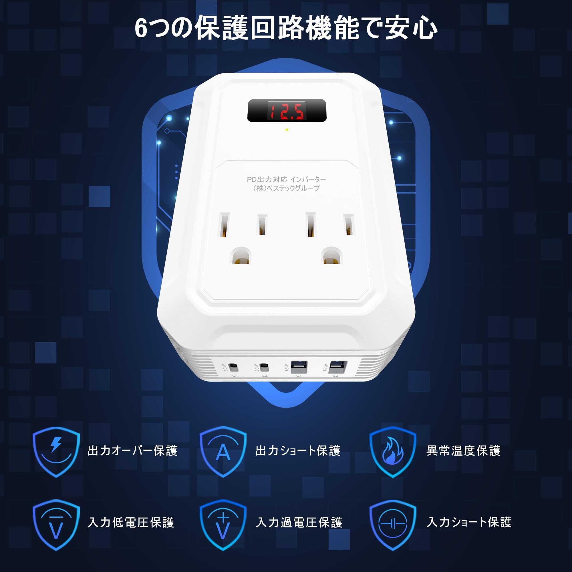 「6保護機能+アルミ筐体+V0耐火材料」 過負荷保護・短絡保護・過熱保護・低電圧保護・過電圧保護・逆接続保護の6段階保護機能を備えています。さらに、放熱性に優れたアルミ合金筐体とV0規格の耐火材料を採用しており、安全性と耐久性を兼ね備えています