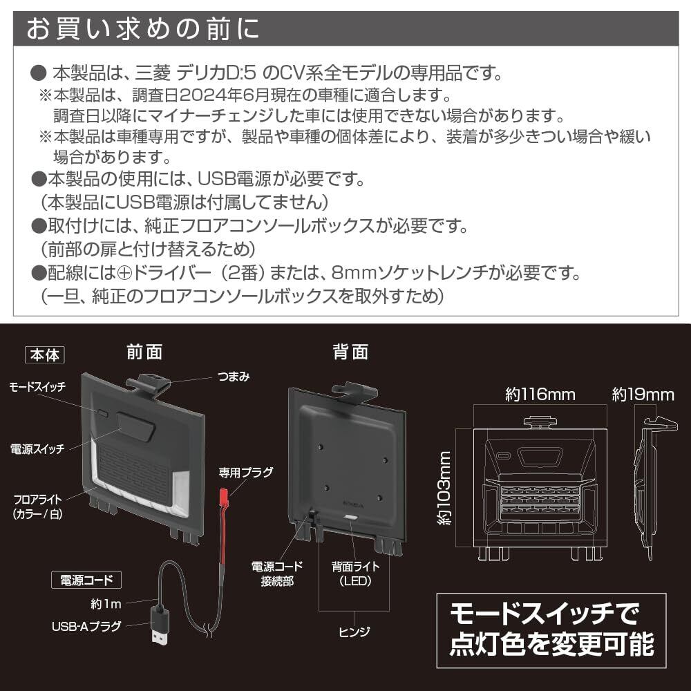 ・フロアコンソールボックスに取付けて、前席の中央フロアと運転席/助手席の足元を照らすライトです。 ・カラー(8色)単色点灯、グラデーション点灯、ホタルモード(蛍のような光り方)を選べて、明るさも自由に調節できます。 ・前席フロアをムーディーに照らし、ナイトドライブを盛り上げます。 ・下方に点灯するので運転の妨げになりにくく、フロアに落とした物を探す時にも役立ちます。 ・エンジンを切って再始動しても降りる前の設定のまま点灯するメモリー機能を搭載。 ・フロアコンソールボックスの下段ボックス(小物入れ)内側を照らすLED照明付きで夜でもボックス内を確認できます。