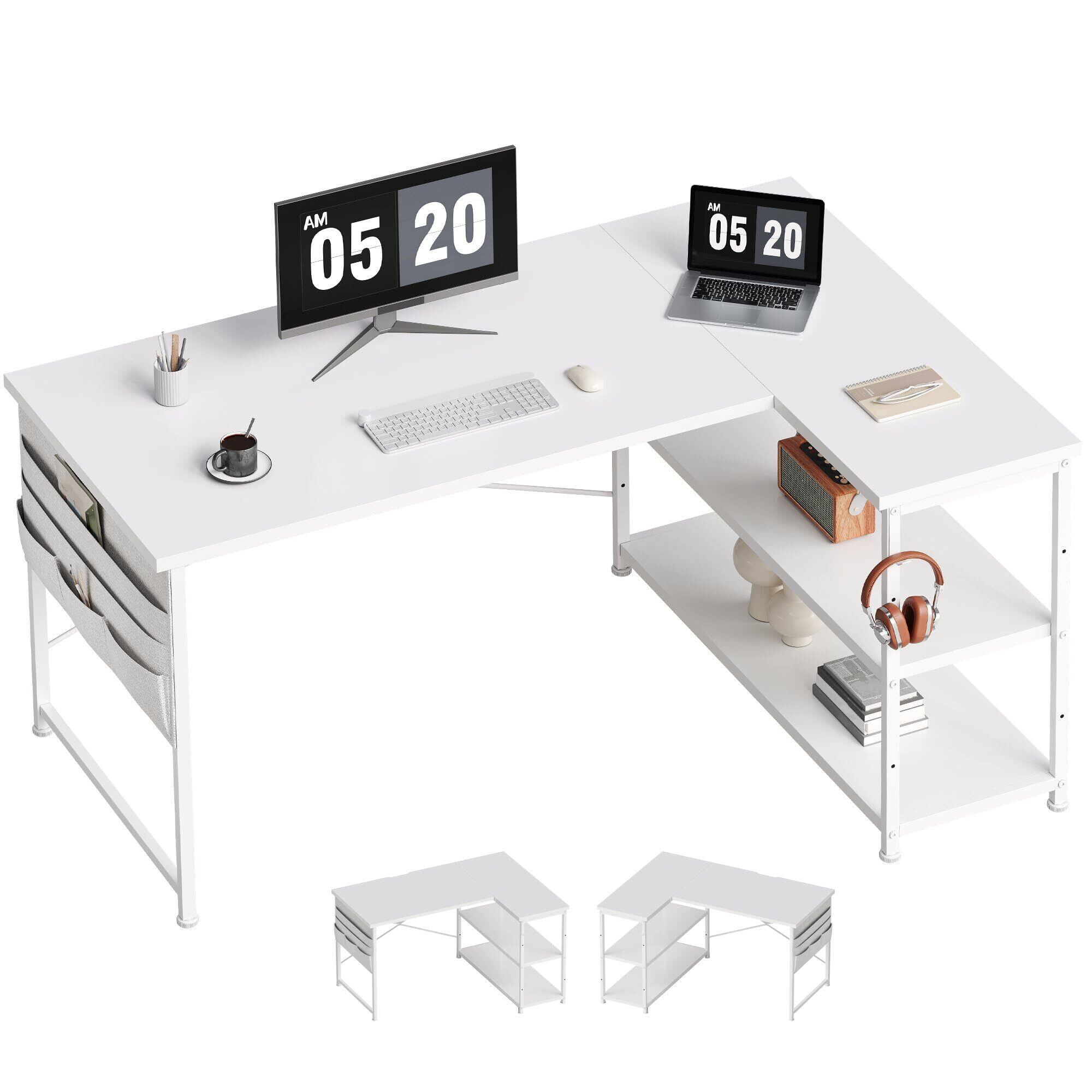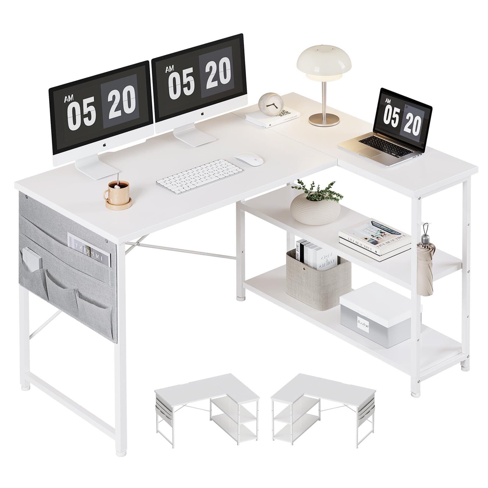 YeTom l字デスク 机 pcデスク ゲーミングデスク 右棚左棚 幅107cm 学習机 ゲーミングテーブル パソコンデスク 勉強机 収納袋付き作業机 白い
